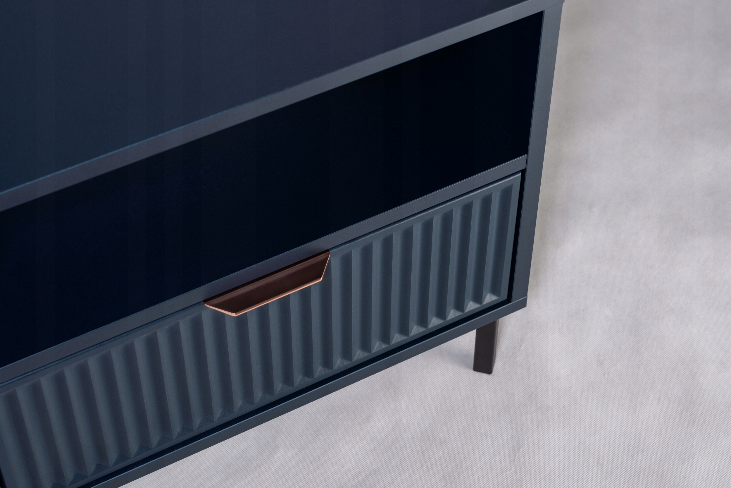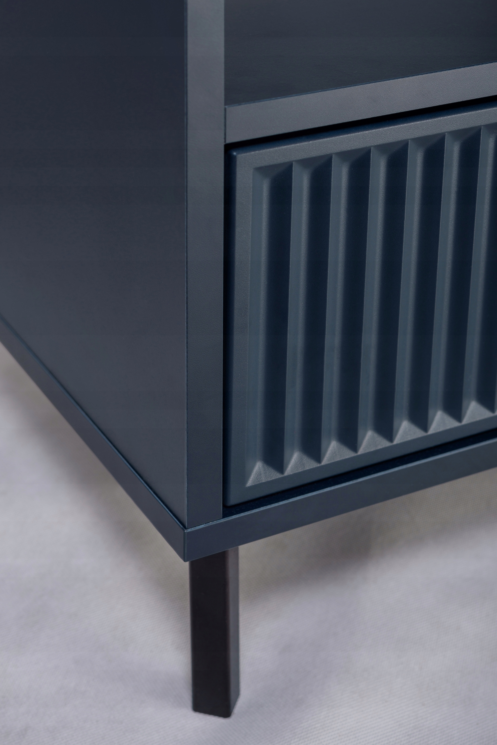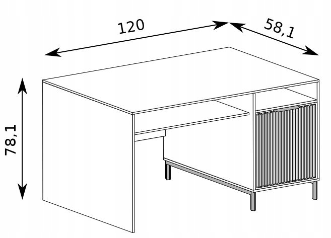 Wyposażone w ryflowane fronty oraz metalowe czarne nóżki, biurko łączy solidność z nowoczesnym wyglądem. Dwie szuflady oraz dodatkowa przestrzeń za drzwiczkami zapewniają wystarczająco miejsca do przechowywania.