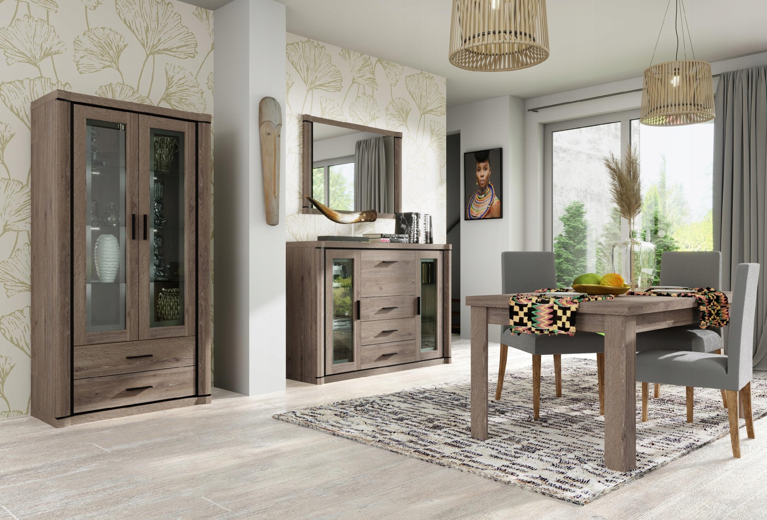 KOMODA SZEROKA DALLAS to stylowy mebel, który doskonale sprawdzi się w salonie lub sypialni. Wykonana w eleganckim kolorze dębu truflowego, oferuje przestronność dzięki pojemnym szufladom z funkcją pełnego wysuwu, które pozwalają na wygodne przechowywanie różnorodnych przedmiotów. Centralnym punktem komody jest lustro, które nie tylko dodaje głębi, ale także umożliwia szybkie sprawdzenie wyglądu przed wyjściem.