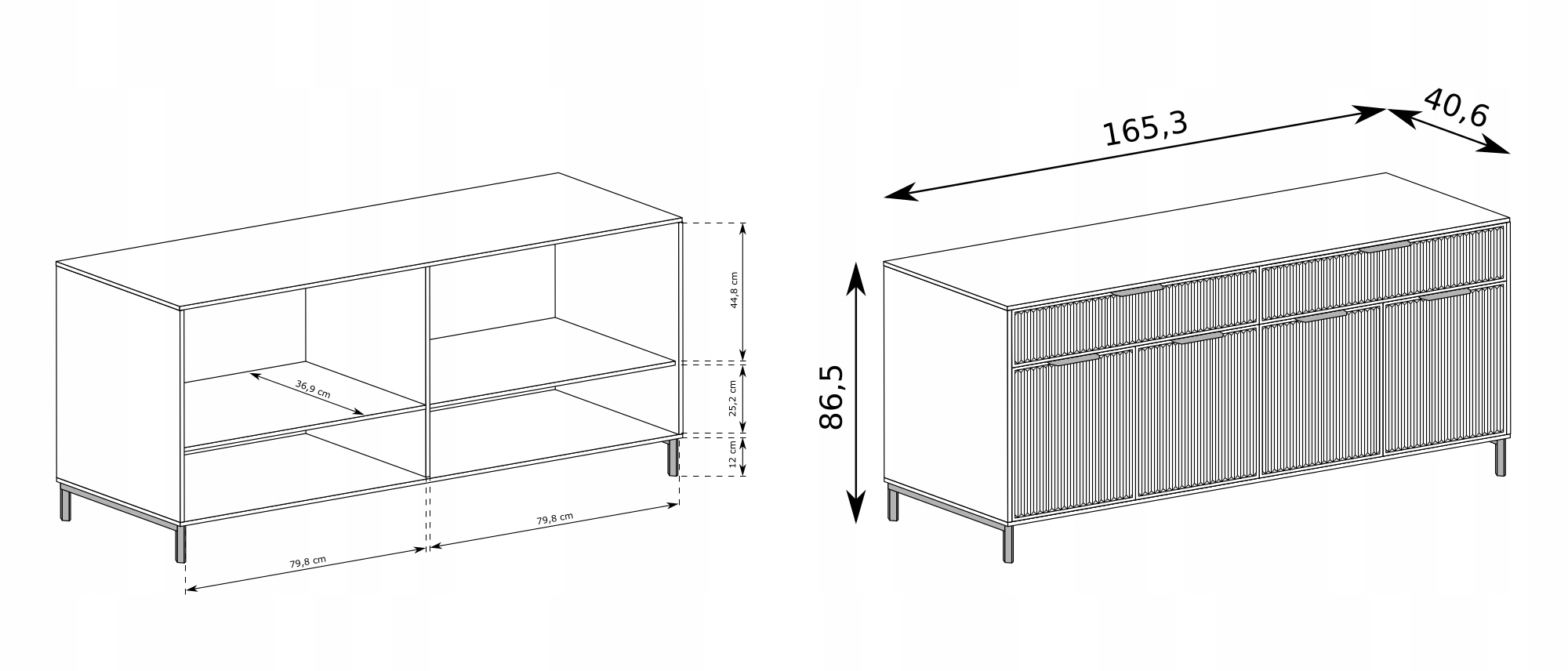 Meble z kolekcji LINK wykonane są w eleganckim kolorze indigo, a ryflowane fronty nadają im unikalnego charakteru. Metalowe czarne nóżki stabilizują całość, dodając nowoczesnego wyglądu. Komoda LINK jest doskonałym wyborem dla osób poszukujących eleganckich, funkcjonalnych mebli, które doskonale wpasują się w współczesne aranżacje wnętrz.
