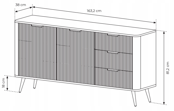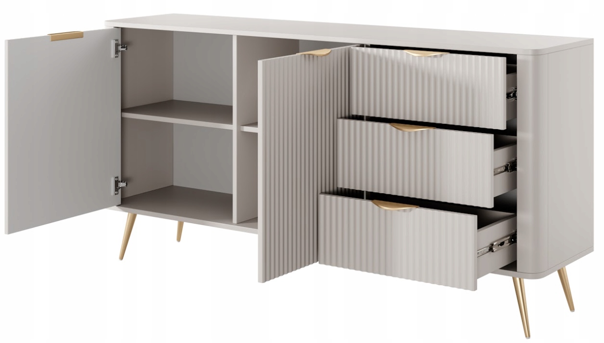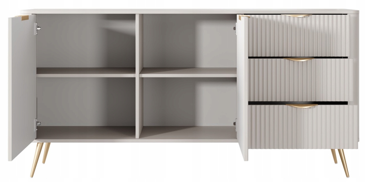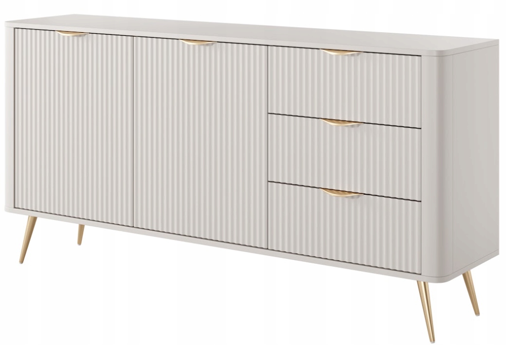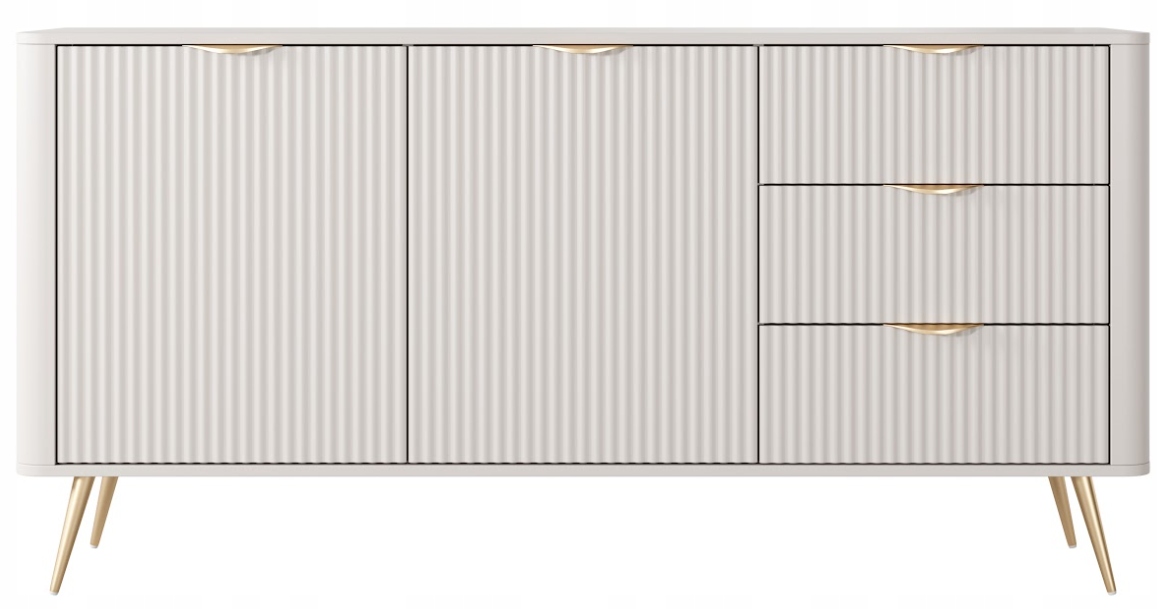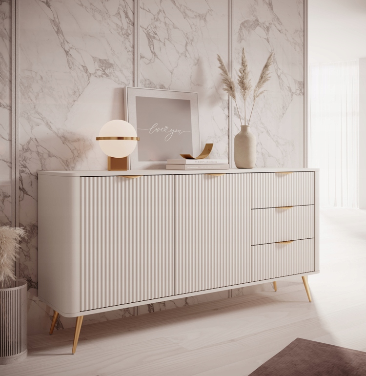 Komoda z kolekcji LANTE to propozycja dla tych, którzy cenią nowoczesne wzornictwo z eleganckim akcentem. Beżowa kolorystyka w połączeniu ze złotymi uchwytami i metalowymi nóżkami tworzy wyjątkowo harmonijny i subtelny wygląd, który doskonale komponuje się zarówno z jasnymi, jak i ciemniejszymi wnętrzami. Ryflowane fronty oraz zaoblone krawędzie dodają bryle lekkości i wyrafinowania, idealnie wpisując się w styl glamour. Funkcjonalny układ dwóch drzwiczek i trzech szuflad umożliwia praktyczne zorganizowanie przestrzeni, łącząc estetykę z codziennym komfortem użytkowania. Komoda została wykonana z trwałych materiałów – fronty z frezowanej płyty MDF, korpus z płyty laminowanej, zaokrąglone listwy boczne również z MDF, a plecy z płyty HDF ze strukturą drewna. Obrzeża wykończono trwałą okleiną ABS. Uchwyty i walcowate nogi wykonano z metalu w złotym kolorze, co nadaje całości eleganckiego wyrazu i zapewnia stabilność. Mebel przeznaczony jest do samodzielnego montażu i został wyprodukowany w Polsce.