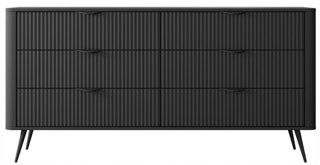 Marzysz o meblu, który doda Twojemu wnętrzu elegancji i jednocześnie zapewni wygodne przechowywanie? Komoda z kolekcji LANTE to stylowy wybór do sypialni, salonu lub garderoby. Beżowe, frezowane fronty w połączeniu ze złotymi detalami tworzą harmonijną całość w duchu nowoczesnej elegancji. Zaokrąglone boczne listwy podkreślają miękką linię bryły, dodając jej subtelnego uroku. Złote, walcowate nóżki optycznie unoszą mebel, nadając mu lekkości i charakteru w stylu glamour. Komoda wyposażona jest w sześć pojemnych szuflad na kulkowych prowadnicach z pełnym wysuwem, dzięki czemu z łatwością uporządkujesz wszystkie potrzebne przedmioty. To doskonałe połączenie estetyki, funkcjonalności i dbałości o detale – mebel wykonany w Polsce z trwałych, starannie dobranych materiałów. Frezowane fronty wykonano z płyty MDF, korpus z płyty laminowanej, a zaokrąglone boczne listwy również z MDF. Plecy mebla to płyta HDF ze strukturą drewna w kolorze beżowym, obrzeża wykończone są trwałą okleiną ABS. Złote uchwyty i walcowate nogi wykonano z metalu, co zapewnia stabilność i elegancki wygląd. Komoda przeznaczona jest do samodzielnego montażu.