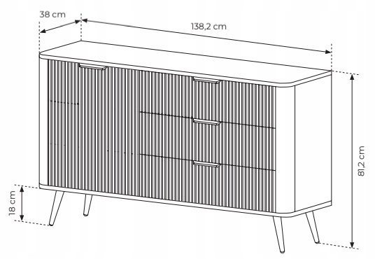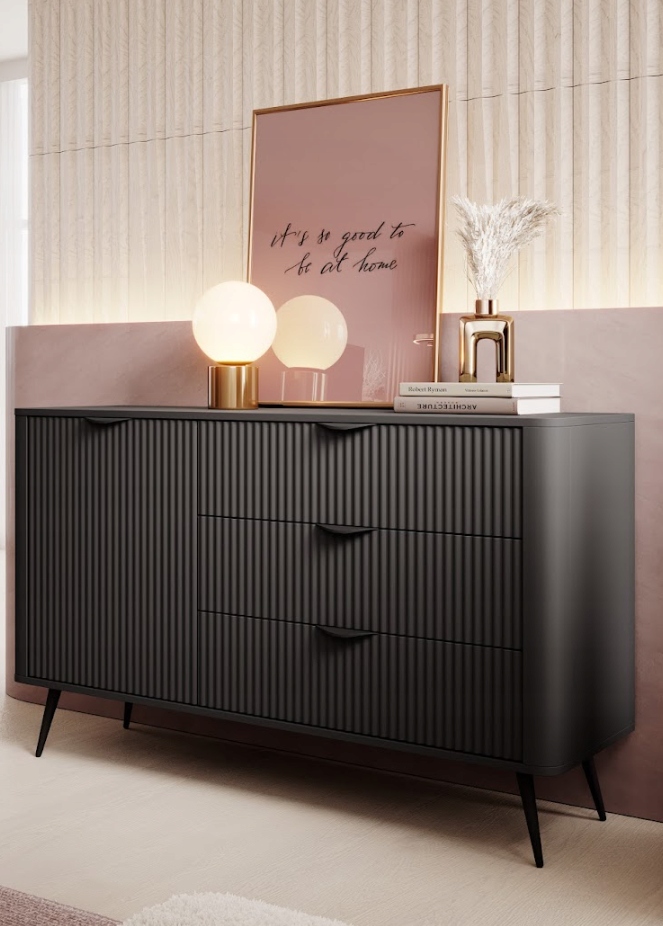 Czarna komoda LANTE o szerokości 138 cm to eleganckie połączenie nowoczesnej formy i ponadczasowego stylu glamour. Matowe wykończenie i frezowane fronty wprowadzają do wnętrza głębię i charakter, a zaokrąglone krawędzie dodają bryle lekkości i subtelnej elegancji. Czarne, metalowe uchwyty i smukłe, walcowate nóżki dopełniają całość w spójnej, monochromatycznej estetyce. Centralnie umieszczone trzy szuflady na kulkowych prowadnicach z pełnym wysuwem oferują wygodną i funkcjonalną przestrzeń do przechowywania odzieży, dodatków czy dokumentów. Komoda została zaprojektowana z myślą o codziennym komforcie i doskonale odnajdzie się zarówno w salonie, sypialni, jak i przedpokoju. Mebel wykonano z wysokiej jakości materiałów, w tym frezowanego MDF i płyty laminowanej, a całość została wykończona trwałą okleiną ABS. Produkt przeznaczony jest do samodzielnego montażu i został wyprodukowany w Polsce.