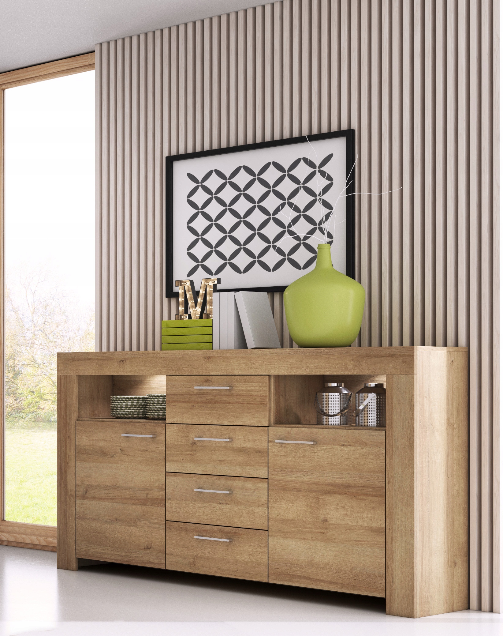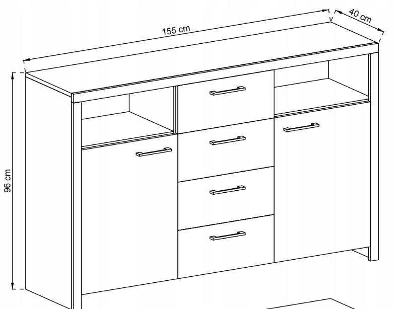 Mebel został wykonany z wysokiej jakości płyty laminowanej o grubości 16 mm, odpornej na zarysowania i codzienne użytkowanie. Korpus zabezpieczono obrzeżem ABS, co znacząco zwiększa jego trwałość. Fronty komody uzupełniają smukłe uchwyty w kolorze srebrnym, wykonane z wysokogatunkowego tworzywa – ich subtelna forma podkreśla nowoczesny charakter kolekcji.