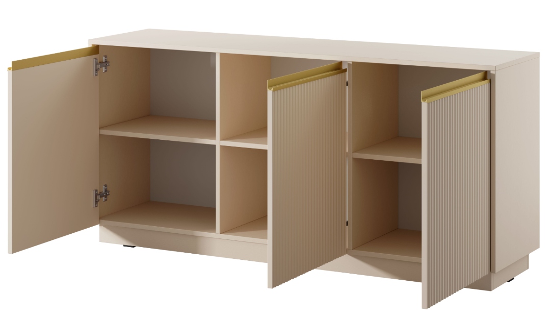 Kolekcja ROYAL to propozycja dla osób, które szukają mebli łączących nowoczesny minimalizm z ponadczasowym stylem i subtelnym akcentem dekoracyjnym. Charakterystyczne, pionowo ryflowane fronty osadzone w prostych korpusach tworzą spójną i wyrazistą formę, która doskonale prezentuje się zarówno w salonie, jak i w jadalni czy sypialni. Złote uchwyty oraz pozioma listwa dekoracyjna dodają bryłom wyrafinowanego uroku, nie zaburzając ich eleganckiego minimalizmu.