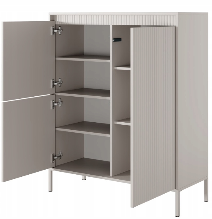 Wysoka komoda z kolekcji SENSO to mebel, który doskonale łączy nowoczesne wzornictwo z funkcjonalnością i spokojną, elegancką kolorystyką. Beżowy odcień korpusu i frontów wprowadza do wnętrza harmonię i subtelną lekkość, tworząc doskonałe tło dla stylowych aranżacji. Połączenie gładkich i frezowanych powierzchni nadaje bryle dynamiki i wyróżnia ją na tle innych, minimalistycznych form.