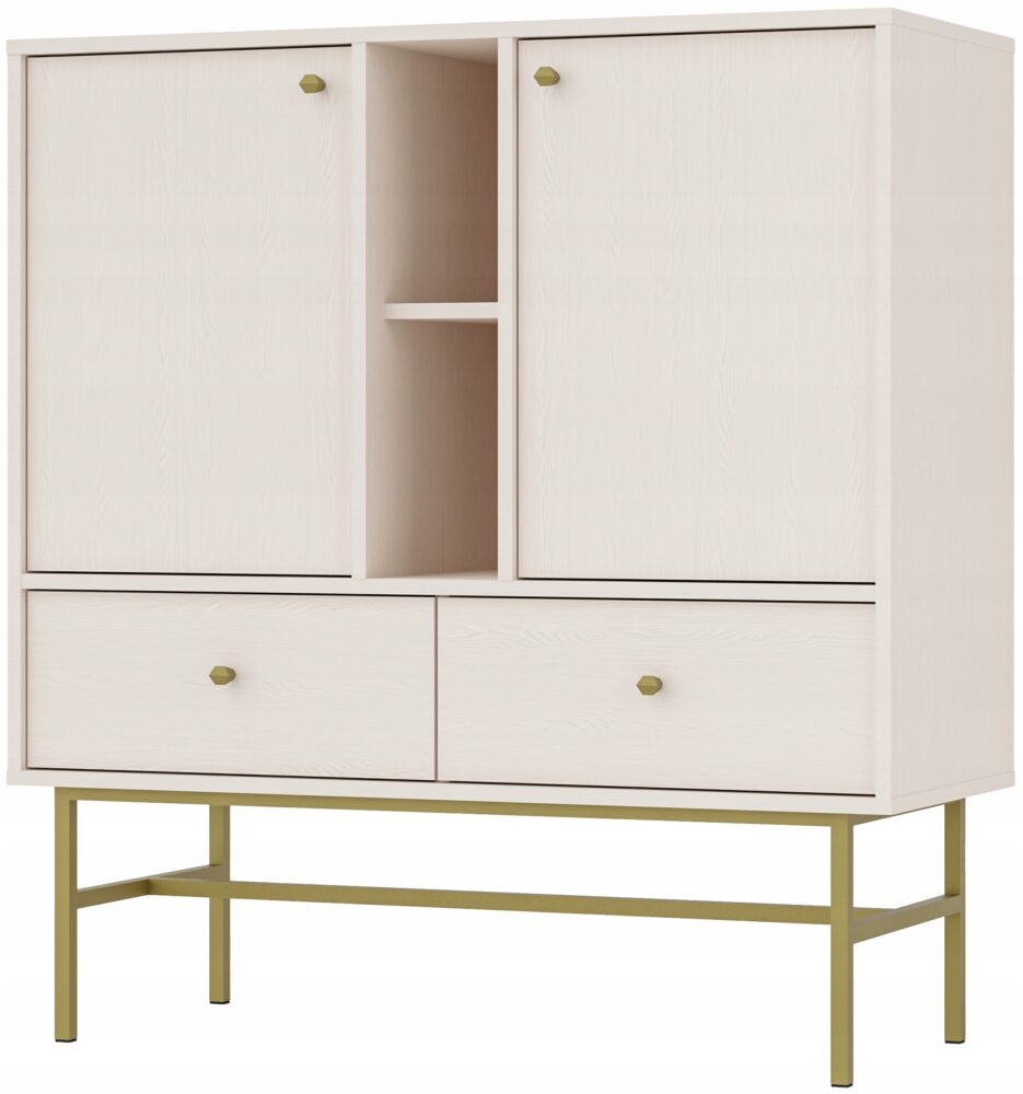 Wyjątkowy design komody podkreślają eleganckie złote metalowe uchwyty i nóżki typu stelaż, które zapewniają stabilność i dodają lekkości całej konstrukcji. Wykonana z wysokiej jakości płyty laminowanej z krawędziami zabezpieczonymi obrzeżem ABS, komoda jest trwała i odporna na codzienne użytkowanie.