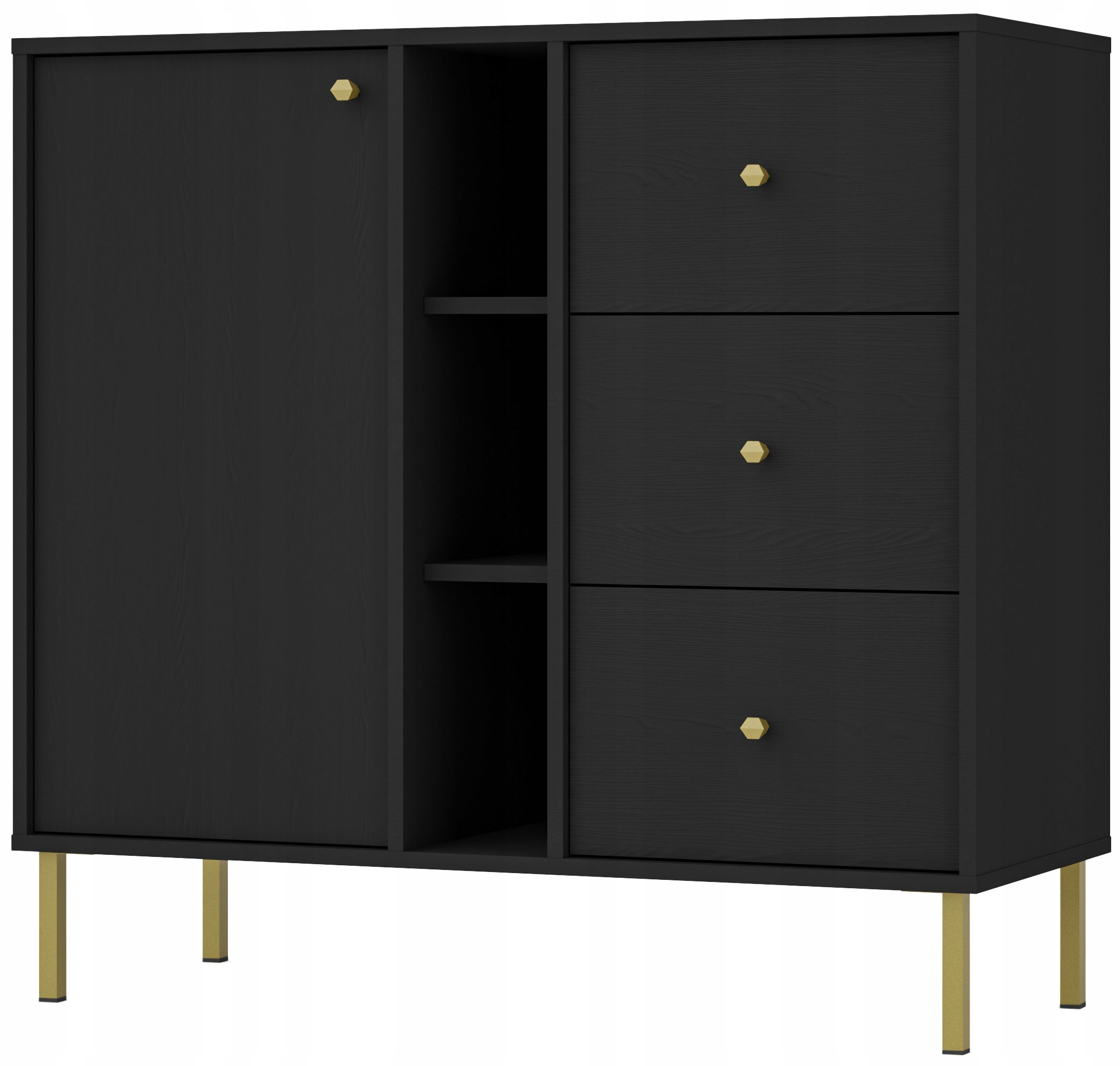 Czarny matowy korpus komody, uzupełniony złotymi metalowymi nóżkami i uchwytami, nadaje całości wyjątkowej elegancji i luksusowego stylu. Dzięki metalowym nóżkom o wysokości 13,5 cm komoda jest stabilna i łatwa do utrzymania w czystości, co sprawia, że jest praktyczna i funkcjonalna w codziennym użytkowaniu. Wykończenia z obrzeżem ABS oraz fronty imitujące strukturę drewna podkreślają jej wyjątkowy wygląd i wytrzymałość, zapewniając trwałość na lata.