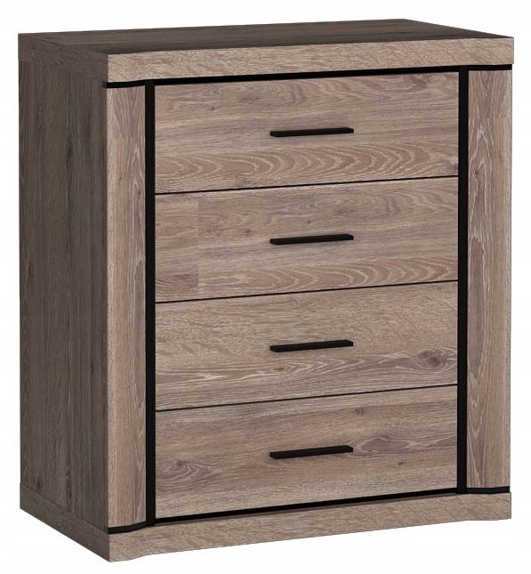 Czarny matowy korpus komody, uzupełniony złotymi metalowymi nóżkami i uchwytami, nadaje całości wyjątkowej elegancji i luksusowego stylu. Dzięki metalowym nóżkom o wysokości 13,5 cm komoda jest stabilna i łatwa do utrzymania w czystości, co sprawia, że jest praktyczna i funkcjonalna w codziennym użytkowaniu. Wykończenia z obrzeżem ABS oraz fronty imitujące strukturę drewna podkreślają jej wyjątkowy wygląd i wytrzymałość, zapewniając trwałość na lata.