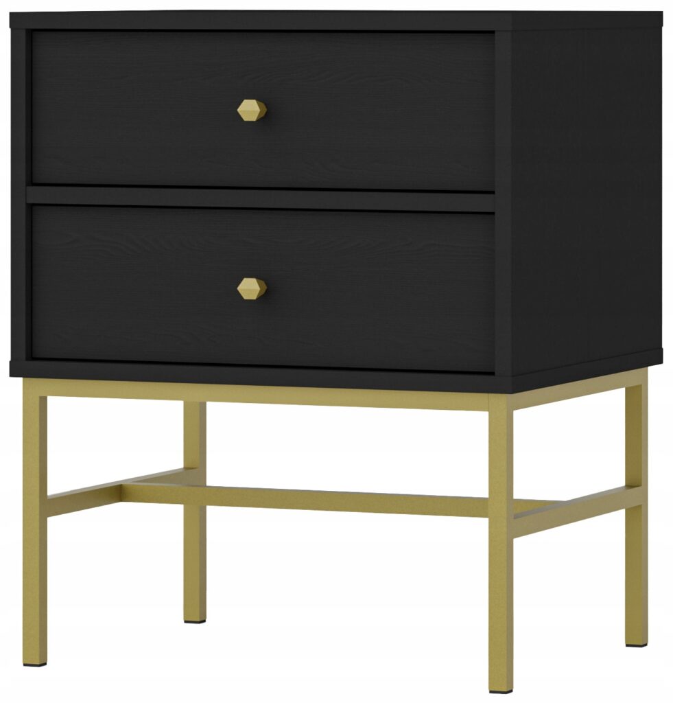 Czarny matowy korpus komody, uzupełniony złotymi metalowymi nóżkami i uchwytami, nadaje całości wyjątkowej elegancji i luksusowego stylu. Dzięki metalowym nóżkom o wysokości 13,5 cm komoda jest stabilna i łatwa do utrzymania w czystości, co sprawia, że jest praktyczna i funkcjonalna w codziennym użytkowaniu. Wykończenia z obrzeżem ABS oraz fronty imitujące strukturę drewna podkreślają jej wyjątkowy wygląd i wytrzymałość, zapewniając trwałość na lata.