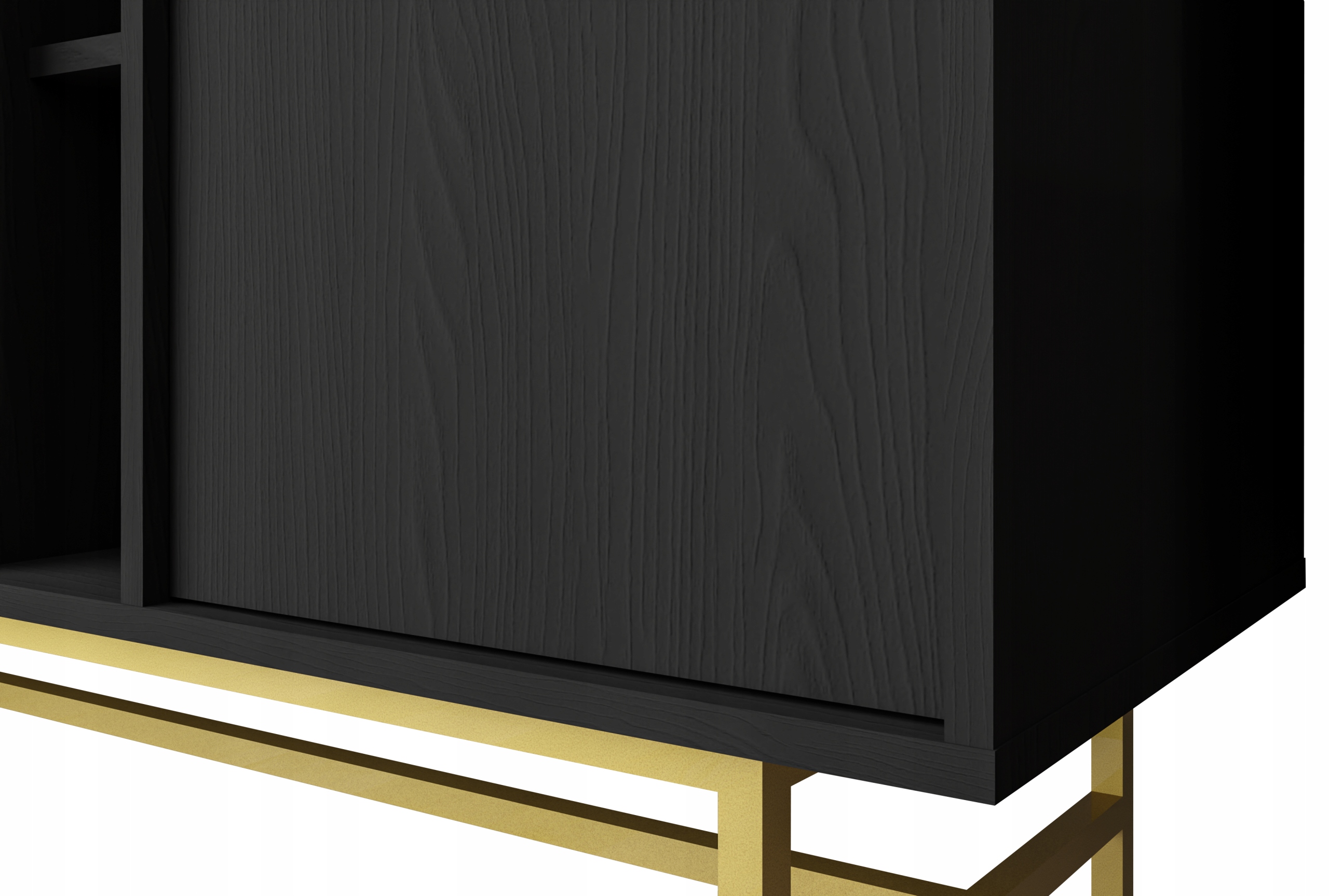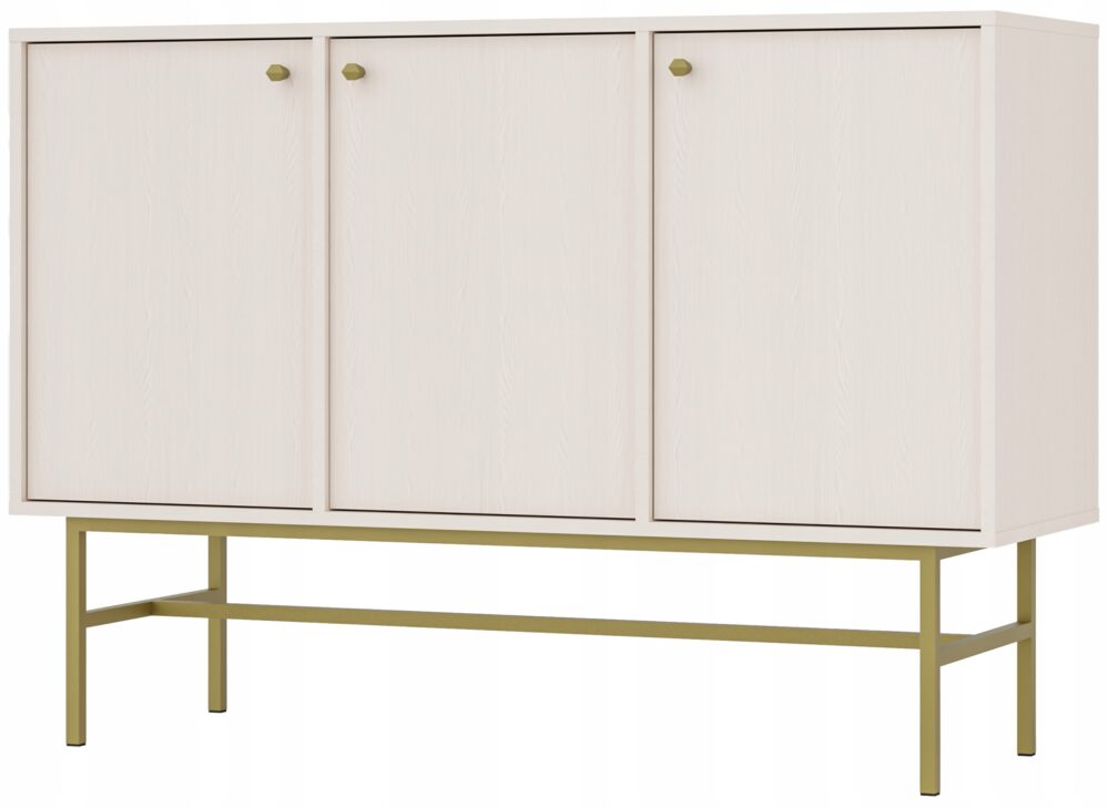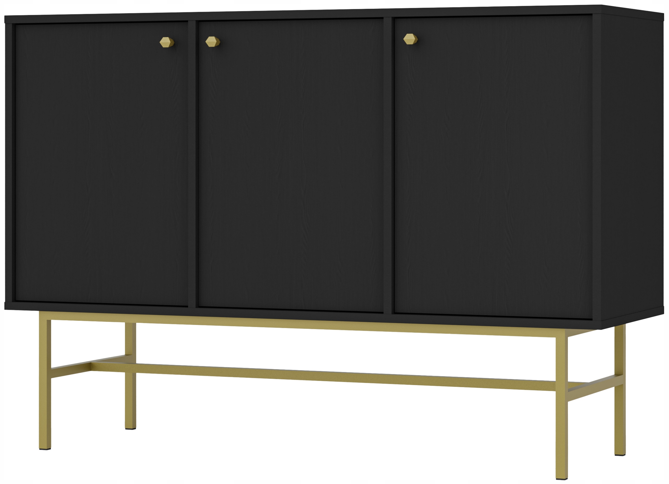 Komoda AVILA o szerokości 125 cm to doskonałe rozwiązanie dla osób, które cenią pojemność i elegancję. Trzy praktyczne drzwi zapewniają łatwy dostęp do przestronnych półek, dzięki czemu organizacja przestrzeni staje się przyjemnością. Wysublimowany czarny grafitowy korpus z delikatną strukturą drewna harmonijnie łączy się ze złotymi metalowymi uchwytami i nóżkami w formie stabilnego stelaża, nadając komodzie luksusowy charakter.