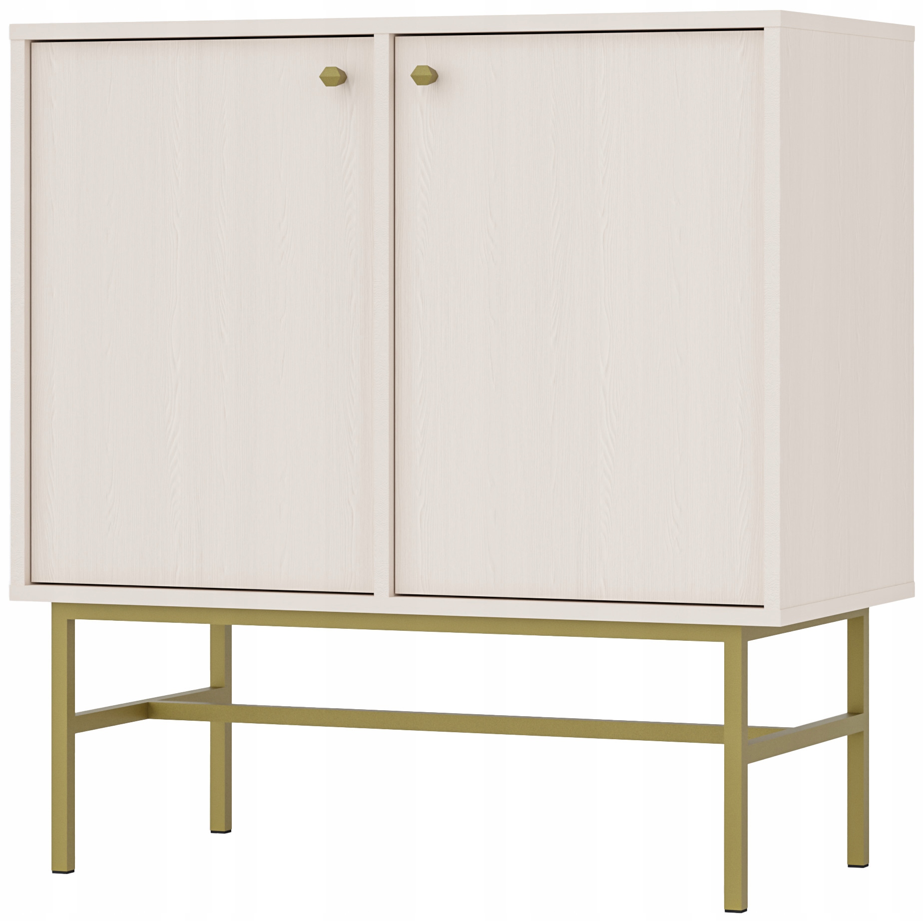Stabilne złote metalowe nóżki i dopasowane uchwyty nadają komodzie wyrazistego charakteru, który doskonale wpisuje się w styl nowoczesny i glamour. Wytrzymałe materiały, takie jak laminowana płyta oraz obrzeża ABS, zapewniają odporność na codzienne użytkowanie, gwarantując trwałość przez długie lata.