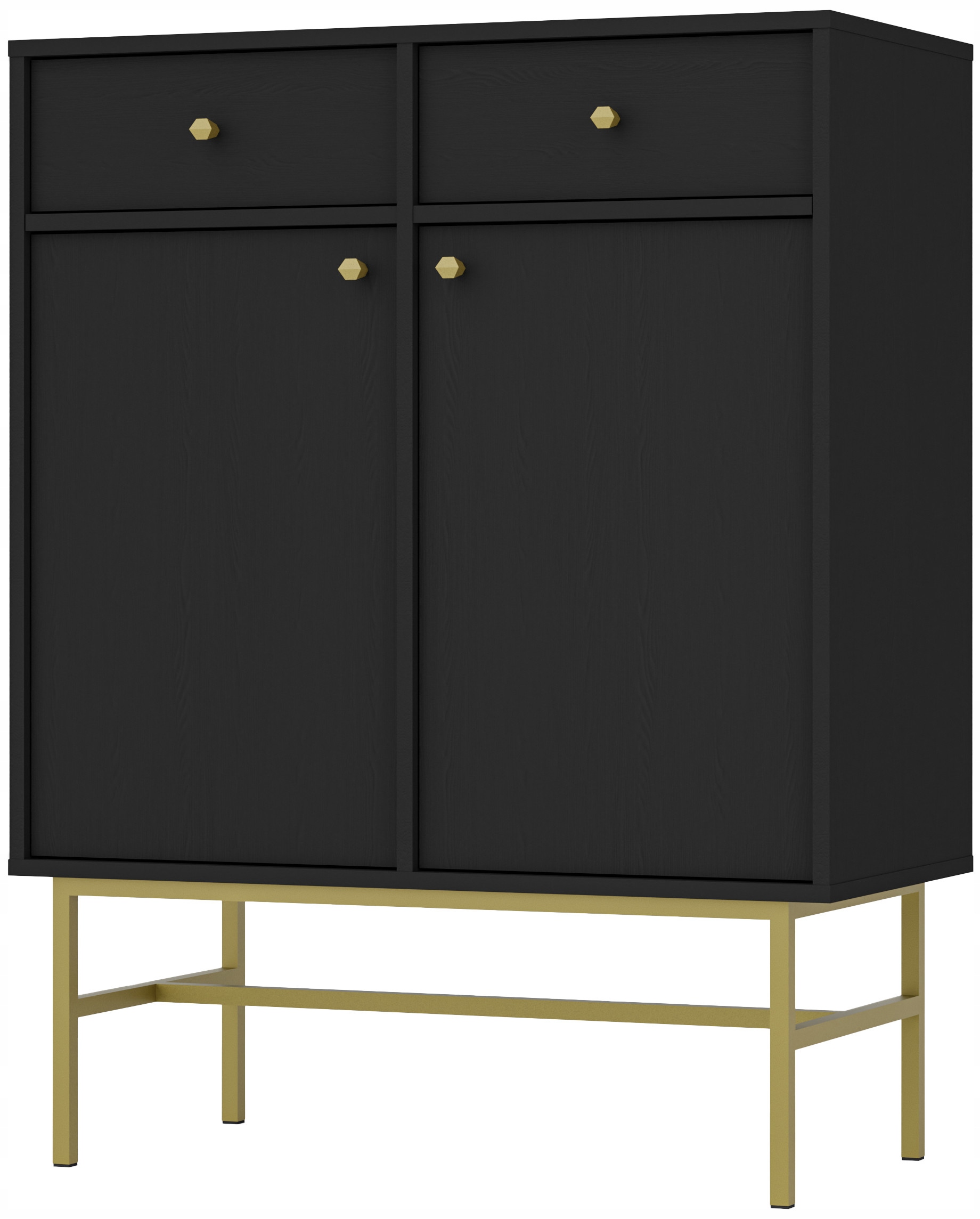 Czarna komoda AVILA to połączenie elegancji i funkcjonalności, które doskonale sprawdzi się w nowoczesnych aranżacjach wnętrz. Charakterystyczne złote metalowe uchwyty i solidny stelaż w złotym kolorze nadają jej luksusowy wygląd, idealnie komponując się z czarną, matową powierzchnią frontów. Komoda wyposażona jest w dwoje drzwi oraz dwie przestronne szuflady, które oferują wygodne rozwiązania do przechowywania najpotrzebniejszych rzeczy. Dzięki temu umożliwia łatwą organizację zarówno drobniejszych przedmiotów, jak i większych akcesoriów, pozwalając zachować porządek i harmonię w przestrzeni.