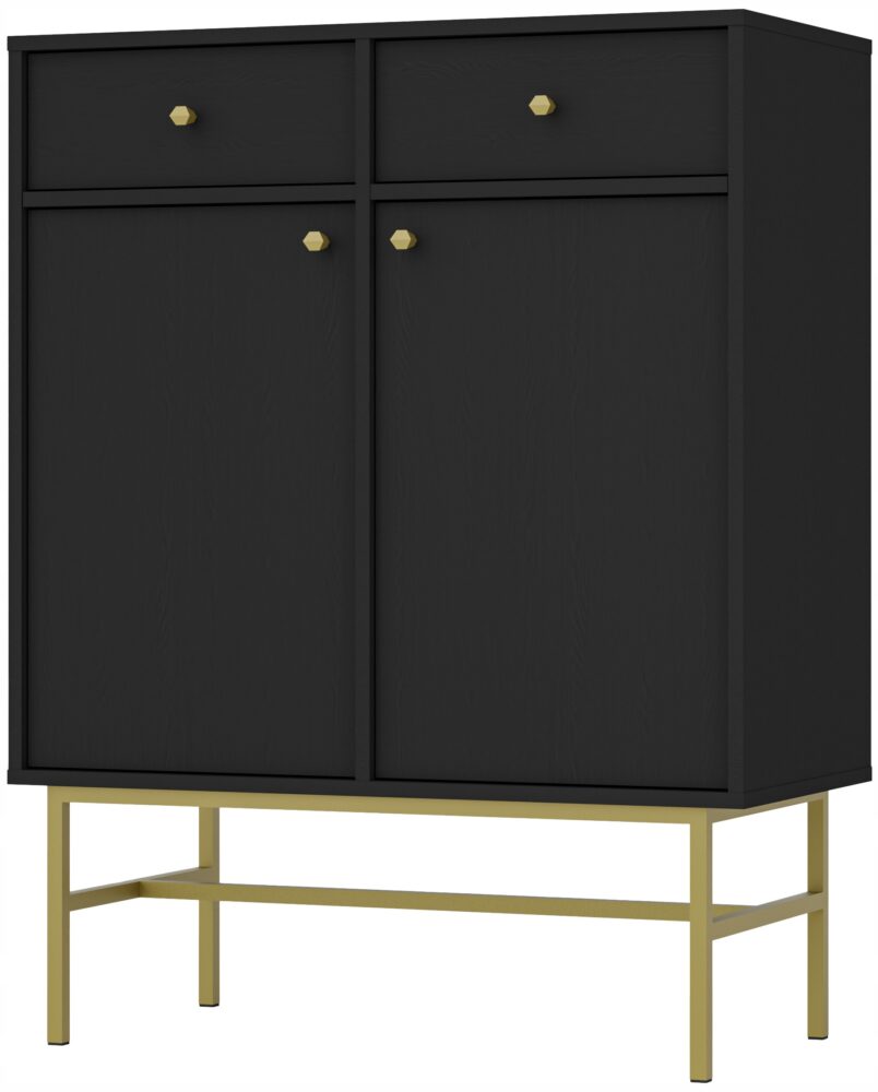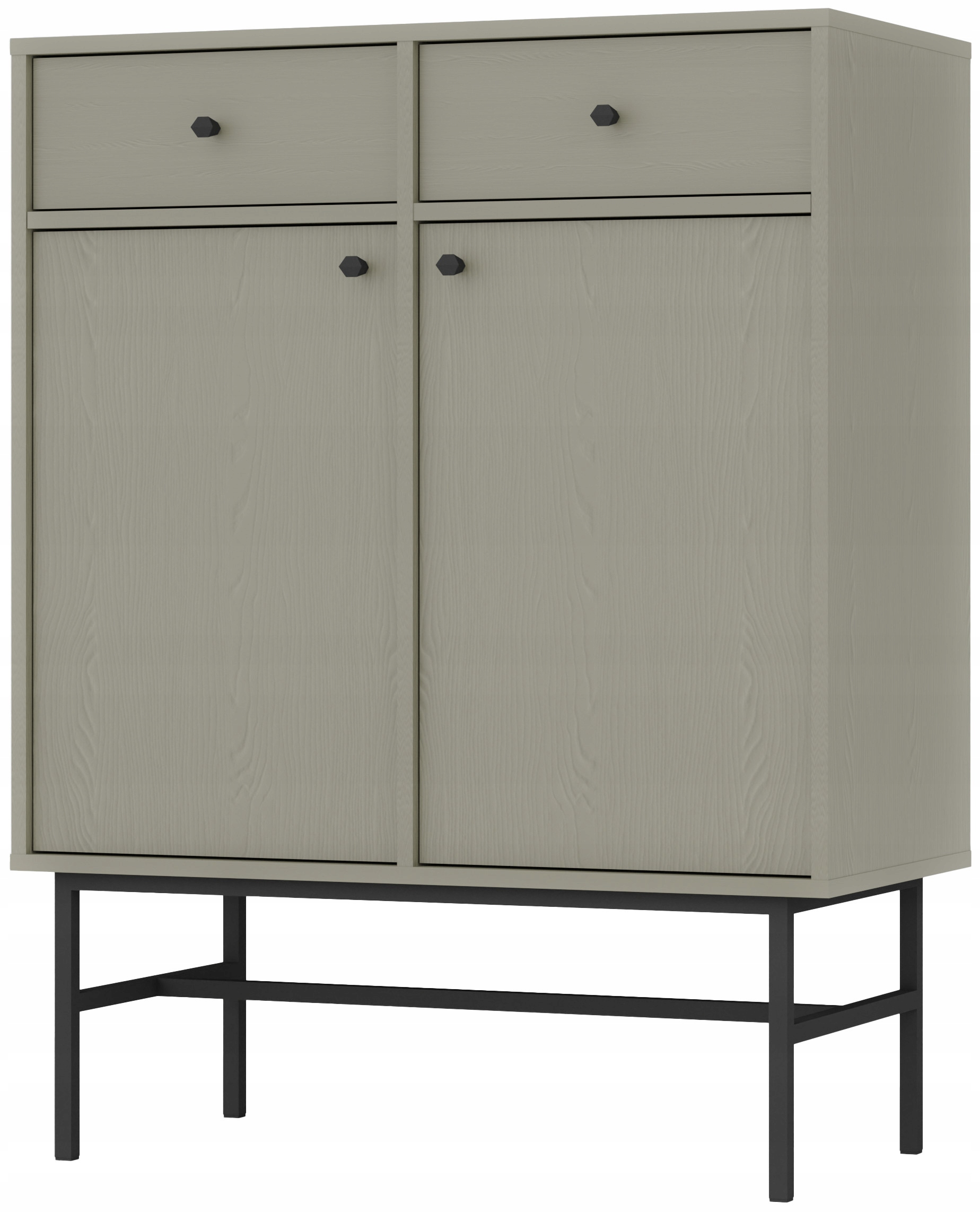 Komoda posiada dwoje drzwi i dwie szuflady, co pozwala na wygodne przechowywanie niezbędnych przedmiotów, dbając o porządek i estetykę wnętrza. Metalowe nóżki ułatwiają sprzątanie pod meblem, a ich wysokość nadaje całej konstrukcji lekkości.