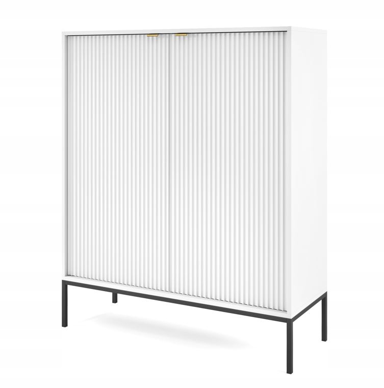 Charakterystyczne ryflowane fronty w połączeniu z złotymi uchwytami tworzą luksusowy i ponadczasowy wygląd. Metalowe nóżki nie tylko dodają jej elegancji, ale także ułatwiają utrzymanie porządku, zapewniając łatwy dostęp do podłogi. Komoda wykonana z wysokiej jakości płyty laminowanej i MDF, z dodatkowymi zabezpieczeniami krawędzi obrzeżem ABS, gwarantuje trwałość i solidność.