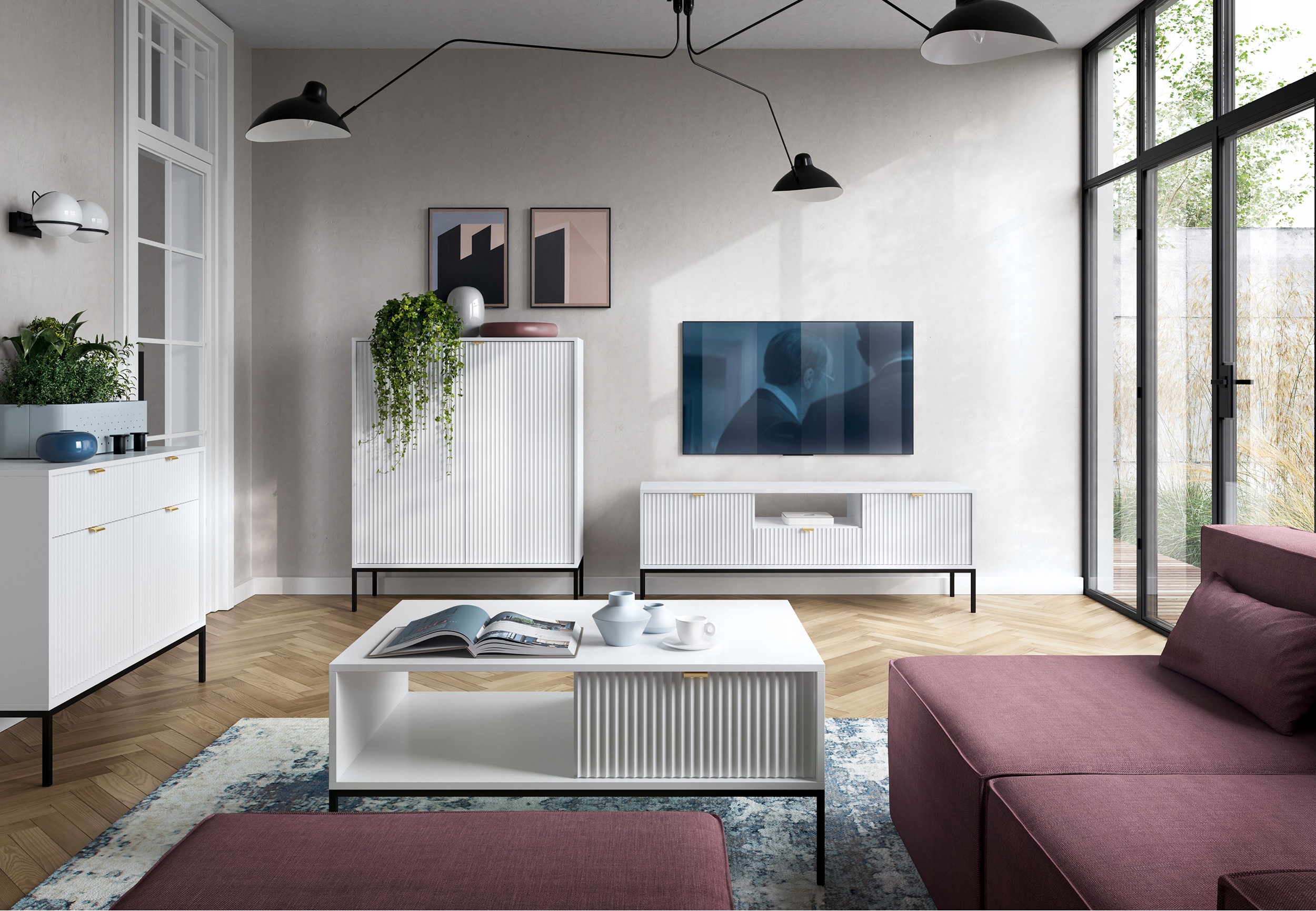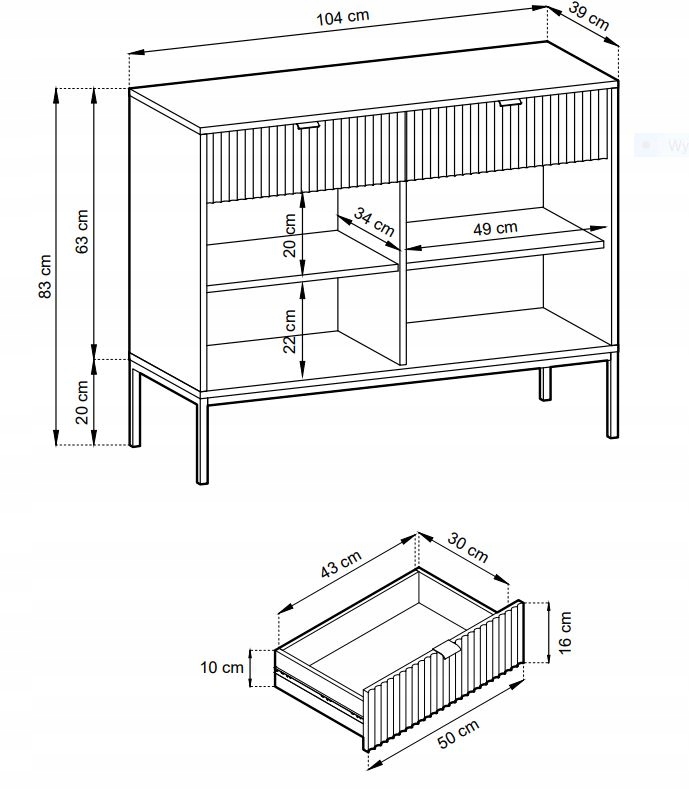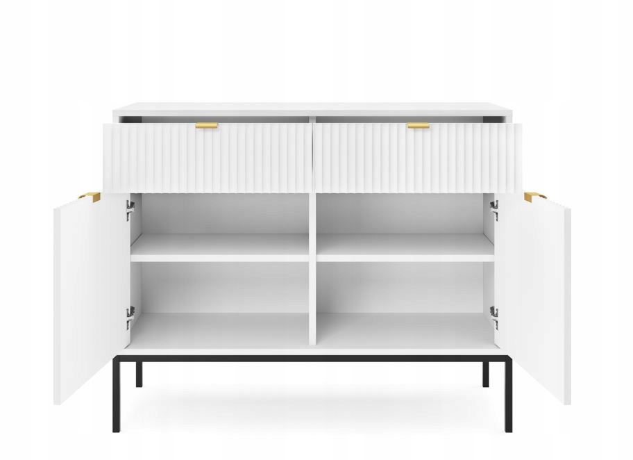 Ryflowane fronty tej komody nadają jej unikalny, ponadczasowy wygląd, a złote uchwyty i czarne metalowe nóżki w loftowym stylu dodają całości nowoczesnego charakteru. Wysoka jakość wykonania z płyty laminowanej i MDF z dodatkowym wzmocnieniem obrzeżem ABS gwarantuje trwałość i solidność. Komoda nie tylko ozdabia wnętrze, ale także ułatwia organizację dzięki przestronnym szufladom i praktycznym drzwiczkom.