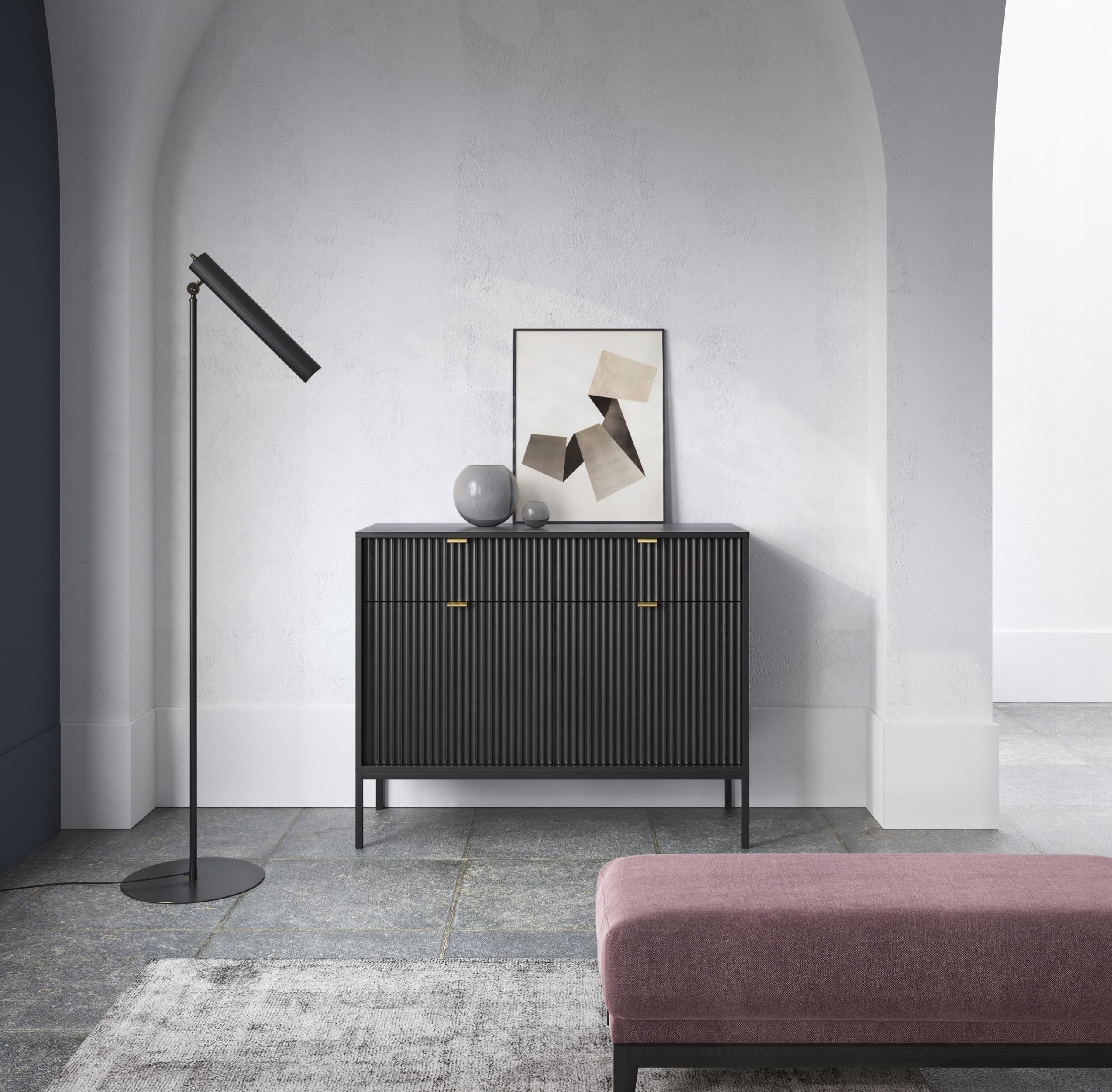 Komoda z kolekcji BELLEZA, wyposażona w dwie szuflady i dwoje drzwiczek, to elegancki mebel, który doskonale łączy nowoczesny styl z funkcjonalnością. Jej ryflowane, trójwymiarowe fronty nadają wnętrzu niepowtarzalny charakter, a złote uchwyty dodają blasku i luksusowego wykończenia. Komoda idealnie wpisuje się zarówno w nowoczesne, jak i klasyczne aranżacje, oferując jednocześnie dużą przestrzeń do przechowywania.