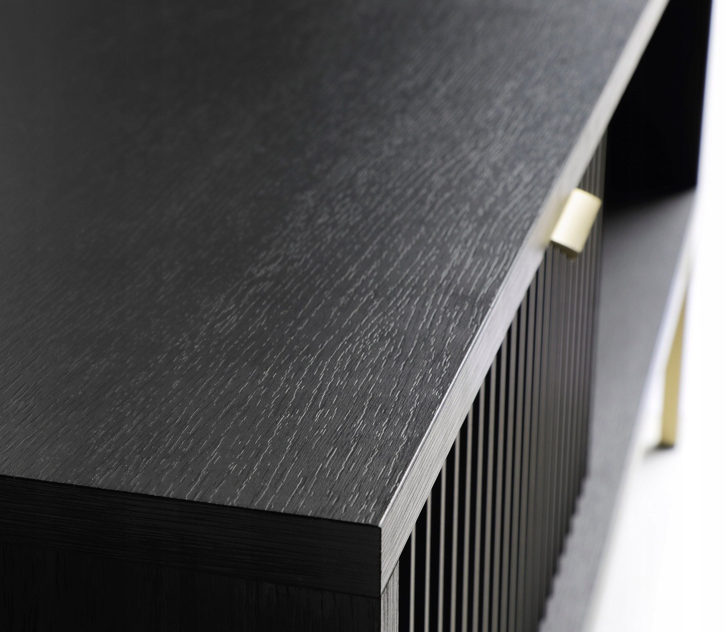 Stabilność i trwałość mebla zapewniają metalowe, czarne nóżki o wysokości 20 cm, które wprowadzają lekkość do wnętrza, a jednocześnie są praktyczne. Komoda została wykonana z wysokiej jakości materiałów, co podkreślają obrzeża zabezpieczone ABS, gwarantujące ochronę i długowieczność. Aluminiowe złote uchwyty stanowią stylowe akcenty, które dodają meblowi prestiżu.