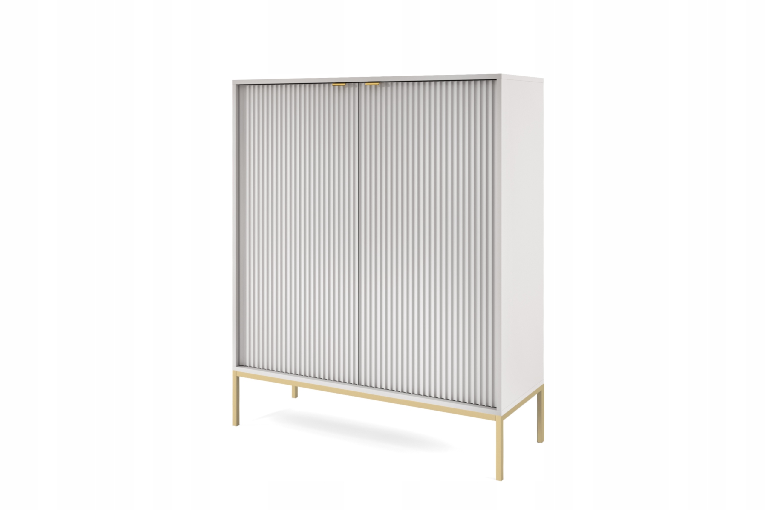 Wyjątkowe frezowane fronty oraz złote uchwyty podkreślają luksusowy design komody, a metalowe, złote nóżki zapewniają stabilność i ułatwiają utrzymanie czystości, nawet przy użyciu odkurzaczy automatycznych. Jej kompaktowy, wysoki kształt sprawia, że idealnie sprawdzi się zarówno w mniejszych, jak i większych pomieszczeniach, oferując funkcjonalność i elegancję.