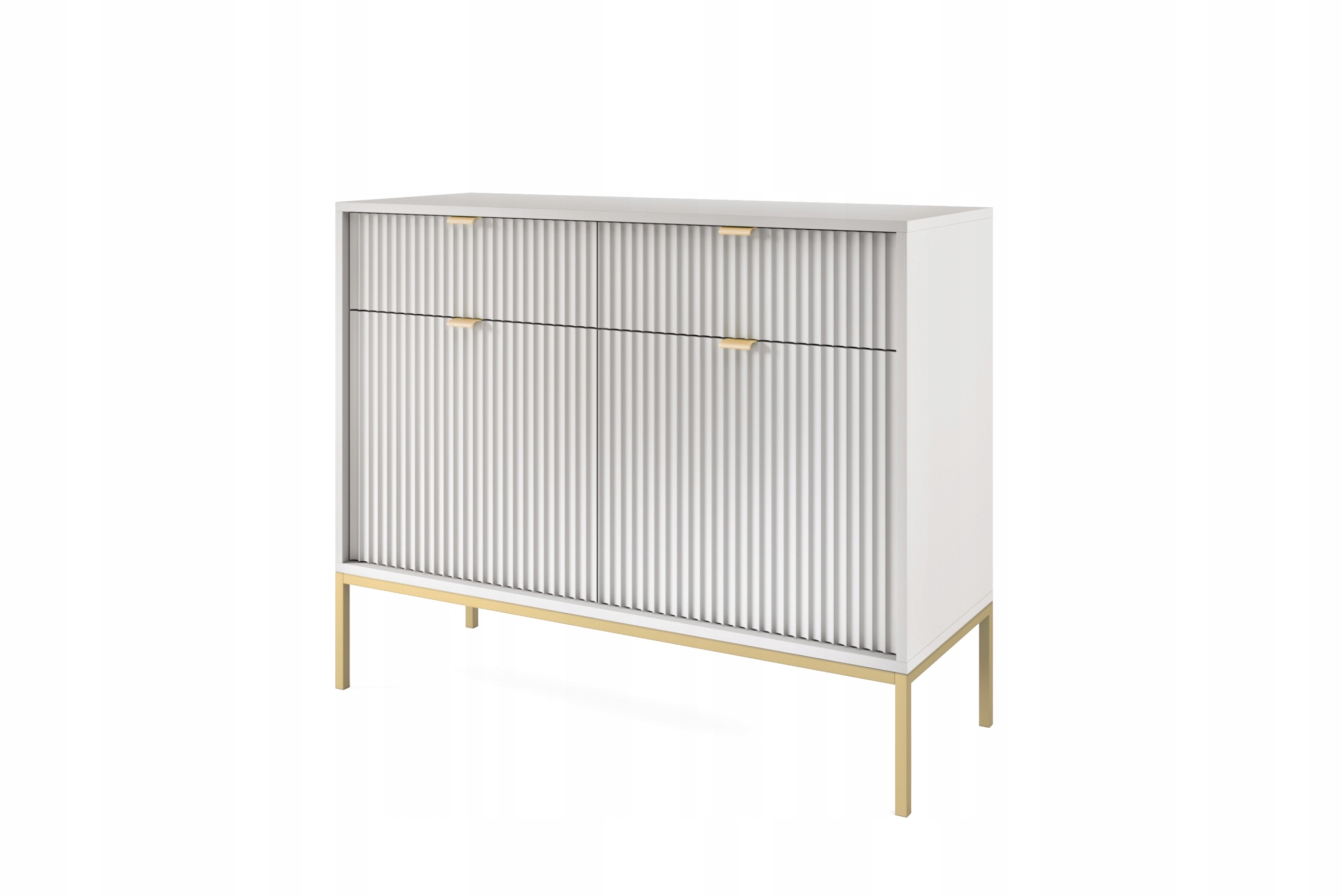 Charakterystyczne frezowane fronty podkreślają wyjątkowy design, a złote metalowe nóżki dodają elegancji i ułatwiają sprzątanie, także za pomocą odkurzaczy automatycznych. Solidna konstrukcja, wzmocniona obrzeżem ABS, zapewnia trwałość i odporność na codzienne użytkowanie.