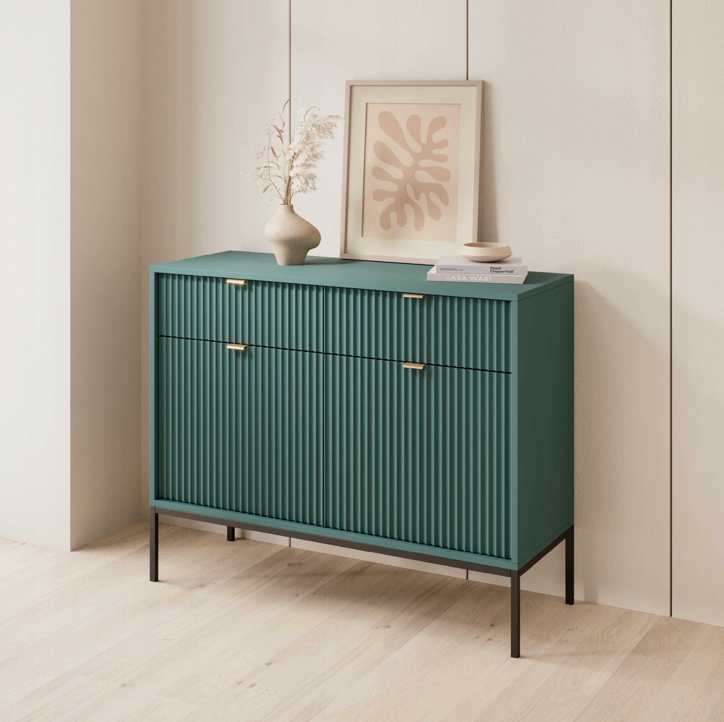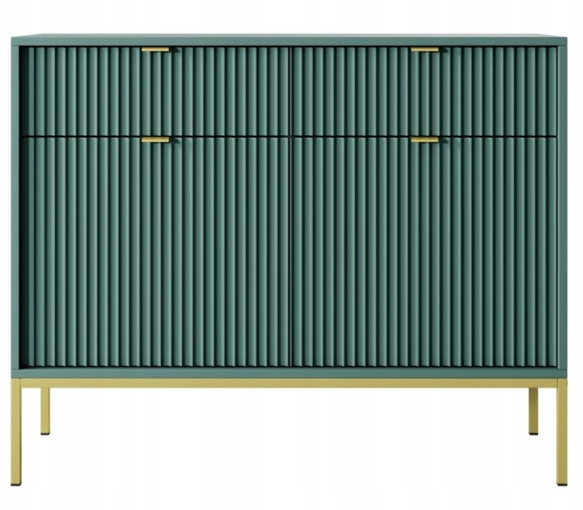 Zielona Komoda BELLAZA to elegancki dodatek do każdego wnętrza, łączący nowoczesny design z klasycznym stylem. Jej zachwycający kolor labrador oraz ryflowane drzwi nadają komodzie wyrafinowany charakter, idealny do salonu, jadalni lub sypialni.
