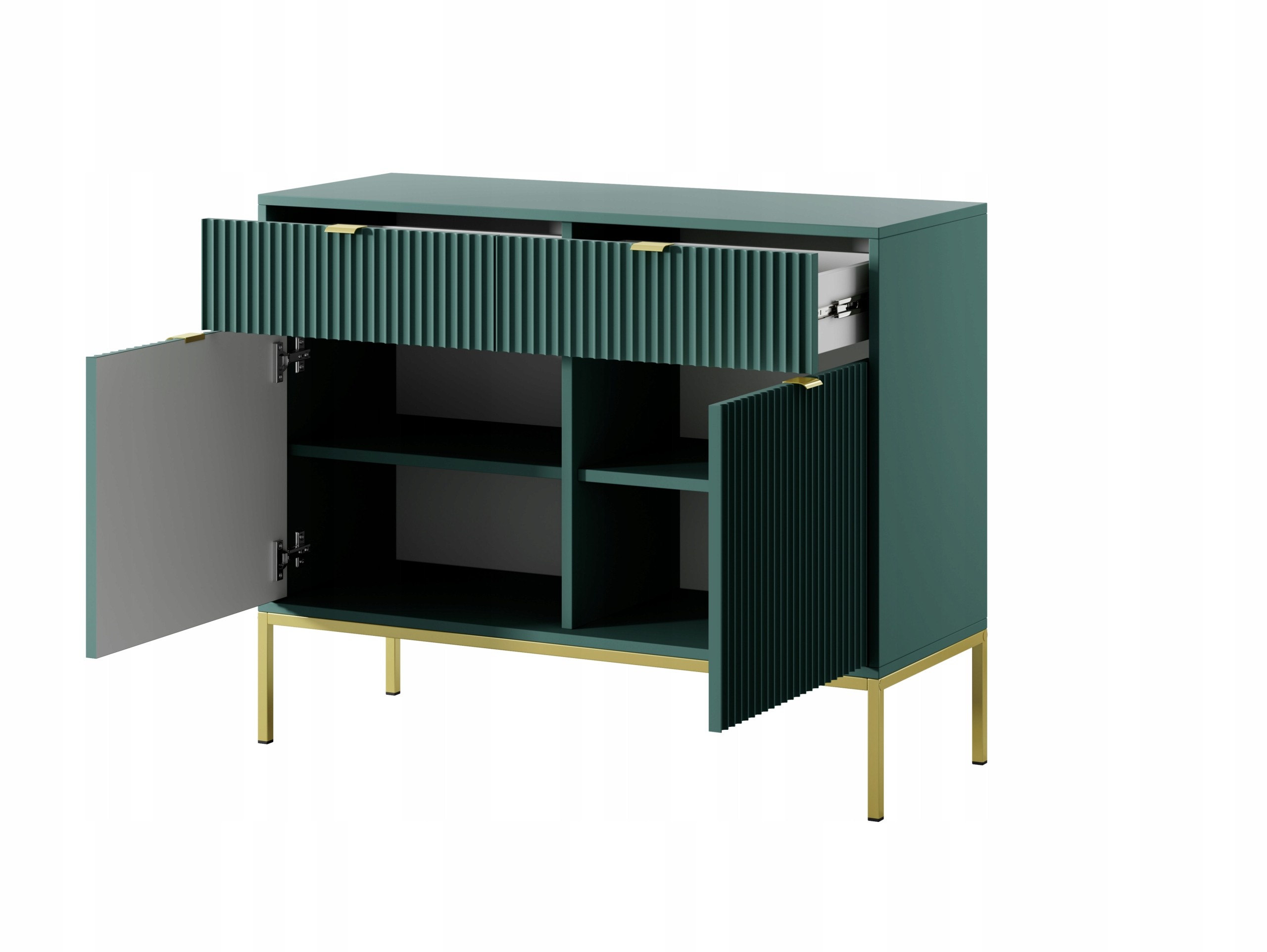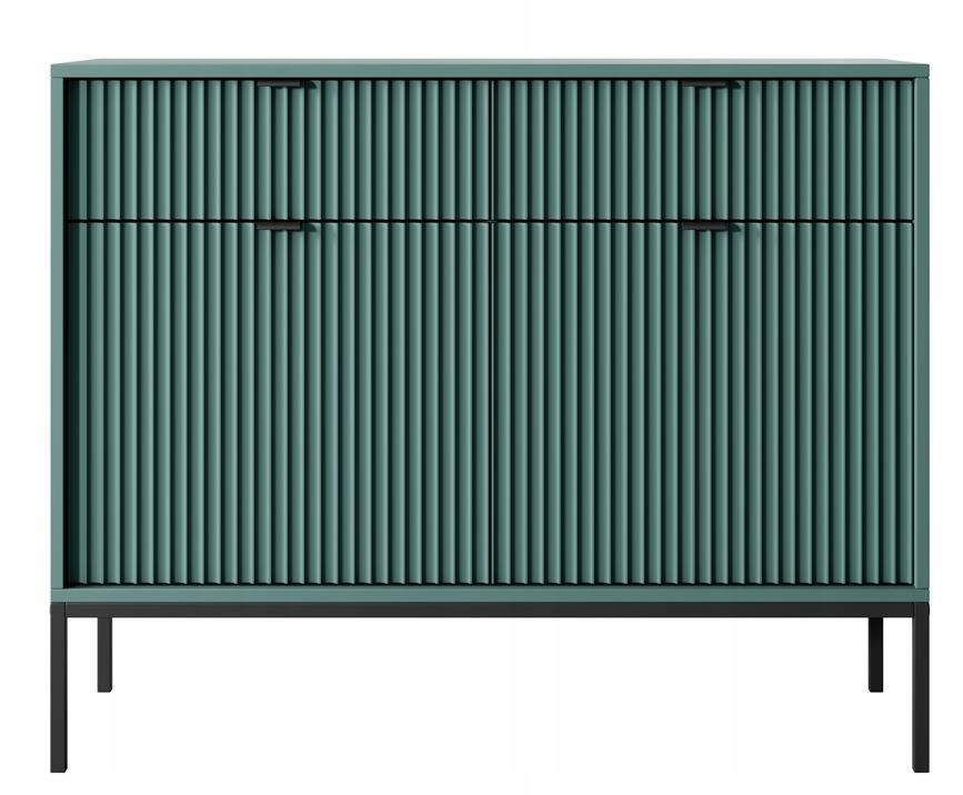 Zielona Komoda BELLAZA to elegancka ozdoba każdego wnętrza, łącząca nowoczesność z luksusem. Wyjątkowy kolor labrador w połączeniu z ryflowanymi frontami nadaje jej subtelny i wyrafinowany charakter. Złote metalowe nogi oraz uchwyty dodają blasku, tworząc harmonijną całość. Komoda posiada dwie szuflady i dwa drzwiczki, co zapewnia wygodną przestrzeń do przechowywania. Doskonale sprawdzi się w salonie, jadalni lub sypialni, oferując funkcjonalność i styl. Idealna propozycja dla tych, którzy pragną wprowadzić elegancję do swojego domu.