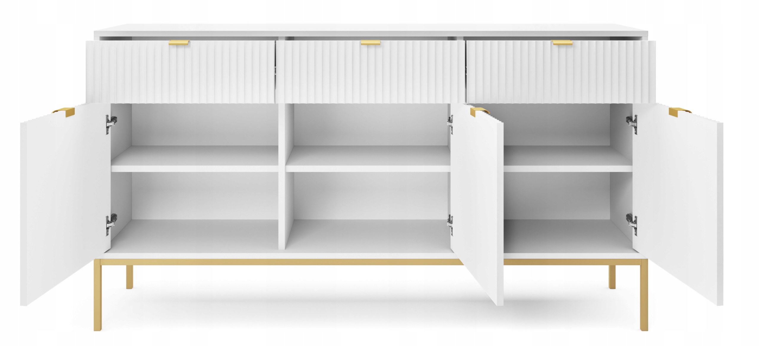 Komoda z kolekcji BELLAZA to elegancka propozycja, która łączy oryginalny design z funkcjonalnością, idealnie pasując do nowoczesnych salonów, sypialni czy jadalni. Białe, matowe fronty z ryflowanymi wykończeniami oraz złote, aluminiowe uchwyty nadają meblowi ponadczasowego charakteru, który przyciąga wzrok.