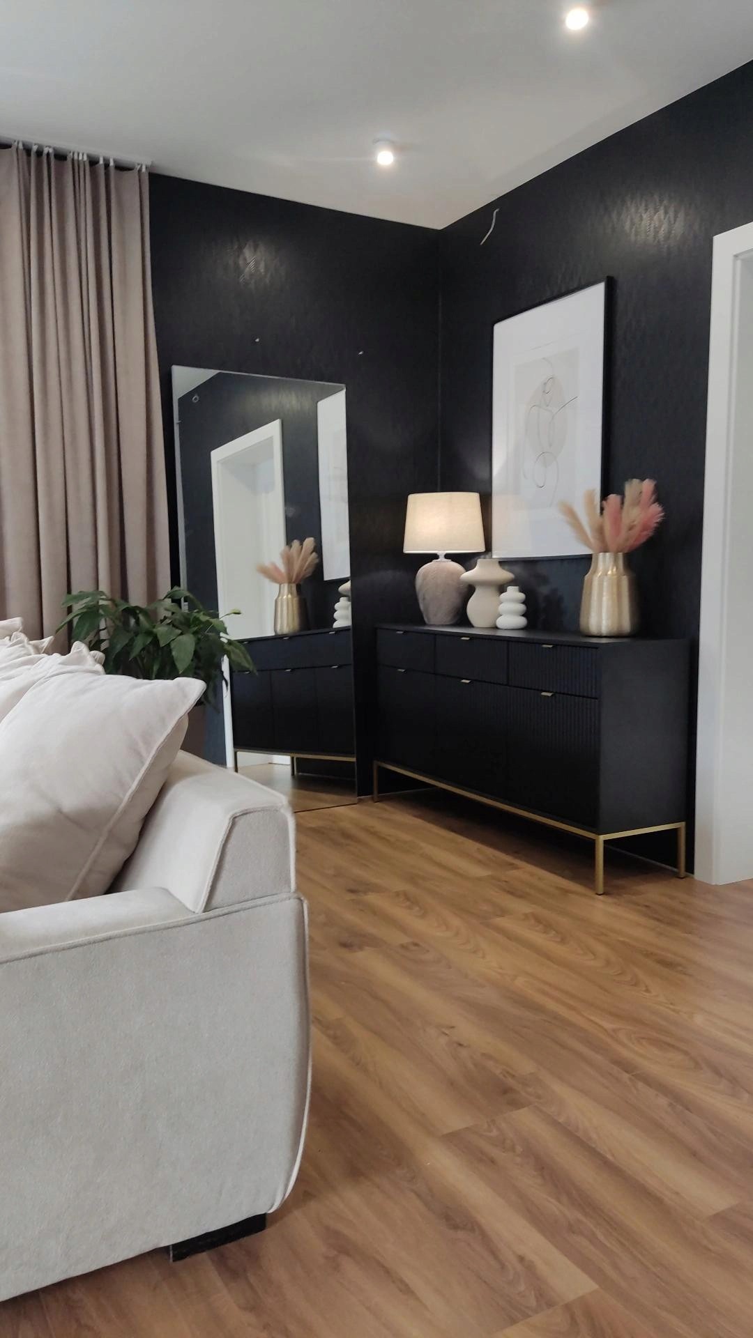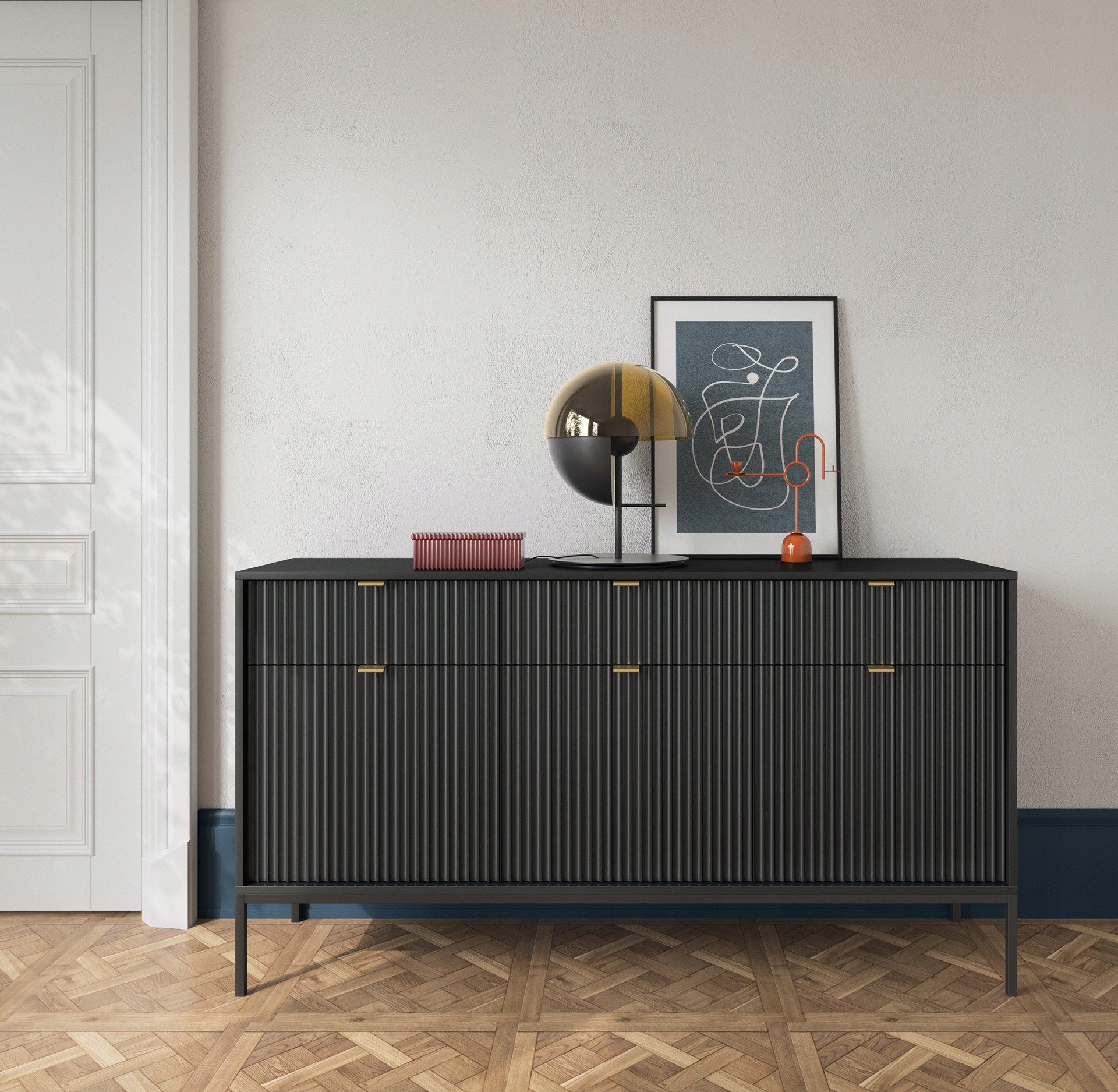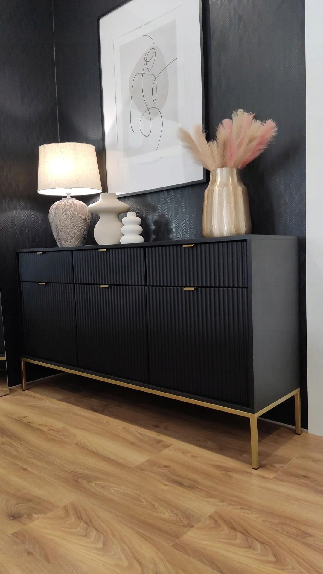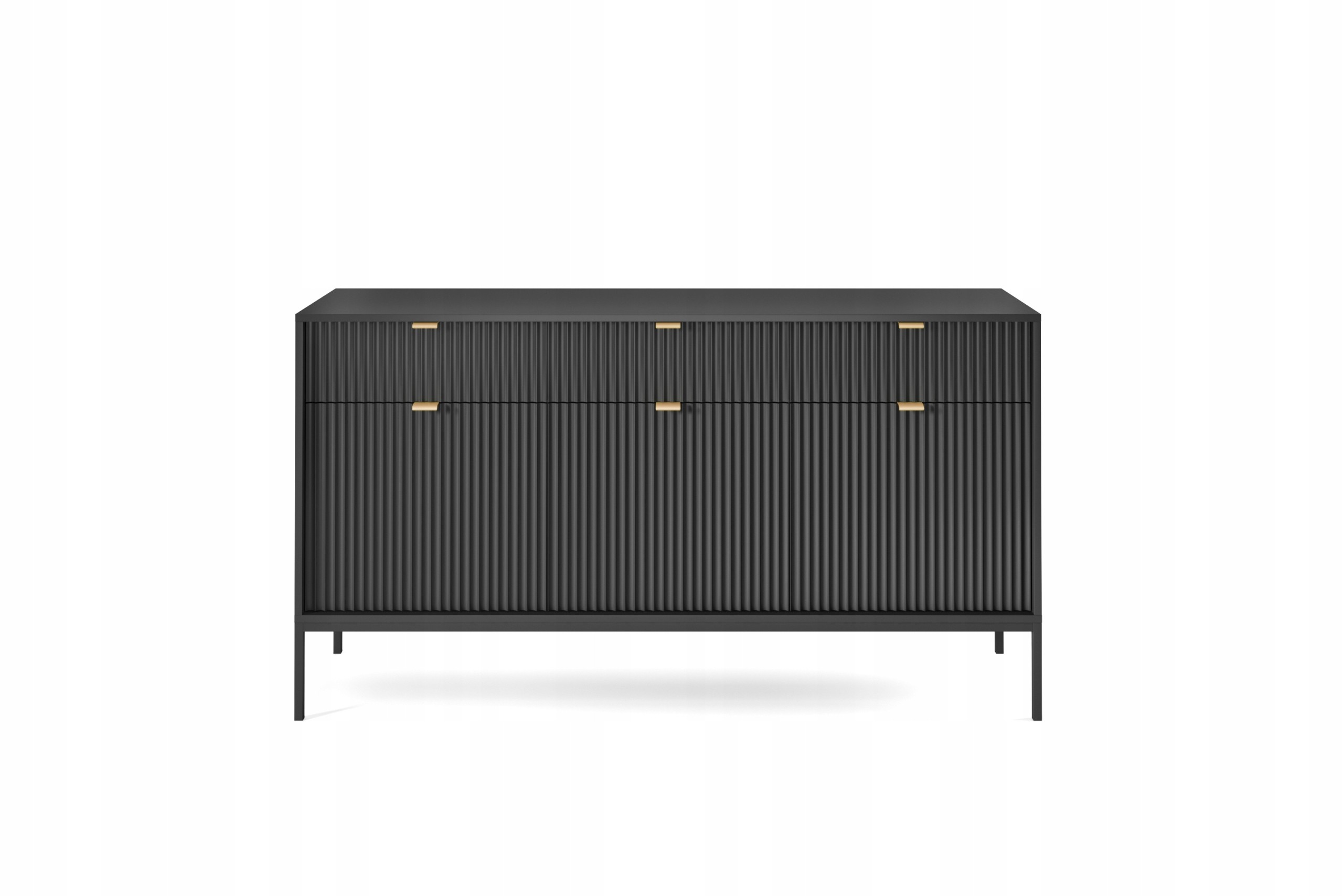 Czarna powierzchnia mebla nadaje mu wyrafinowanego charakteru, podczas gdy ryflowane fronty wprowadzają subtelną teksturę, przyciągając wzrok i dodając głębi. Złote uchwyty nie tylko podkreślają luksusowy wygląd komody, ale również wprowadzają elegancki kontrast, który ożywia całość.