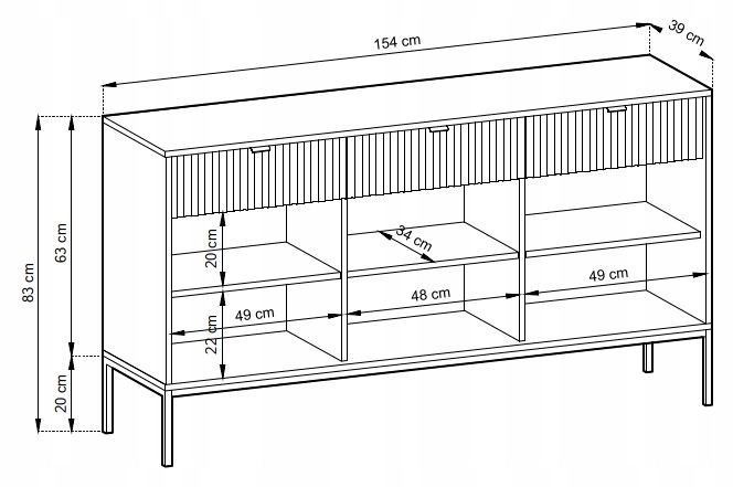 Komoda Szeroka BELLEZA w głębokim czarnym kolorze to synonim elegancji i nowoczesności, idealna do salonu, sypialni czy jadalni. Jej imponująca konstrukcja wyposażona w trzy pojemne szuflady i dwoje drzwiczek sprawia, że staje się niezastąpionym elementem wyposażenia każdego wnętrza, umożliwiając przechowywanie różnorodnych akcesoriów w stylowy sposób.
