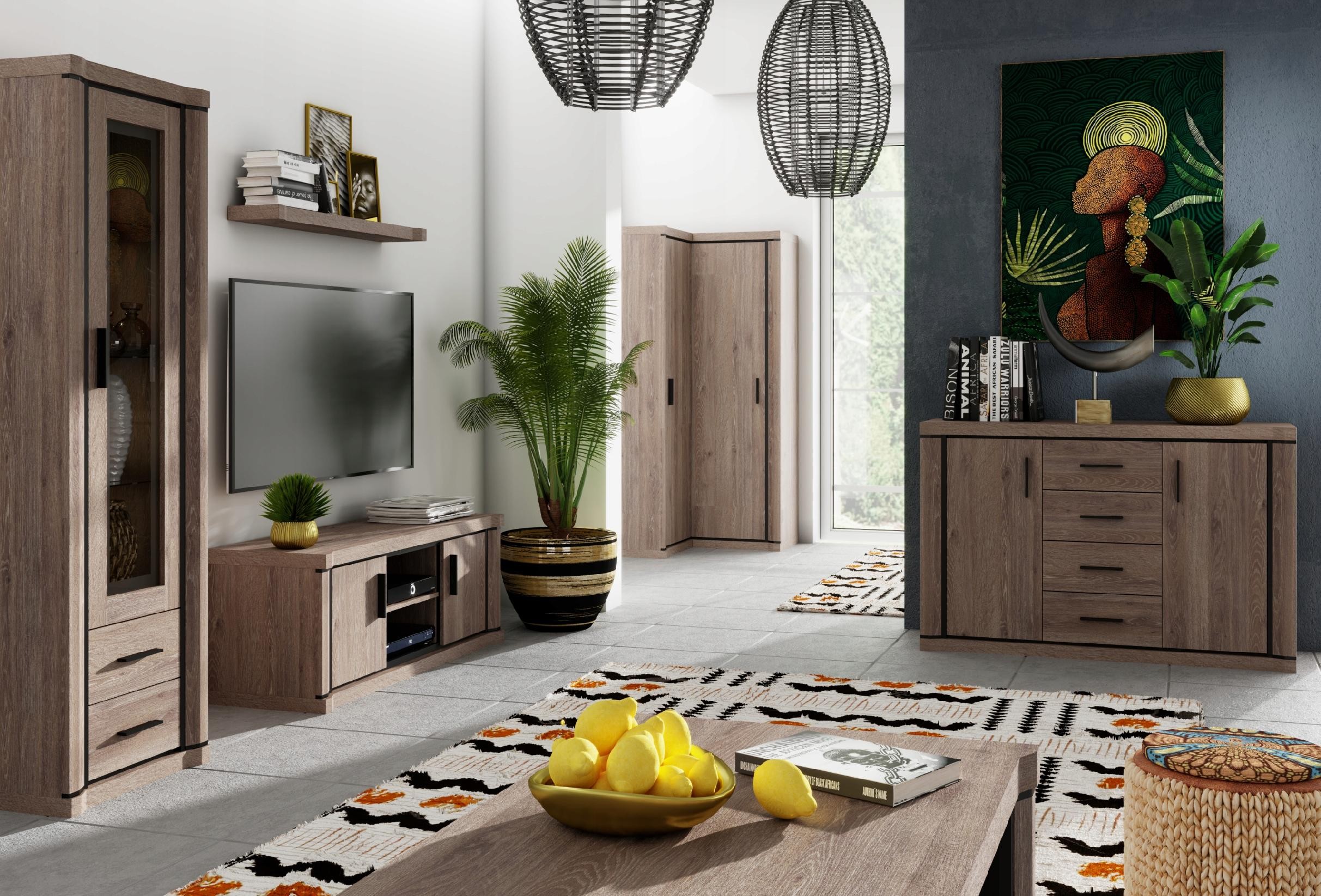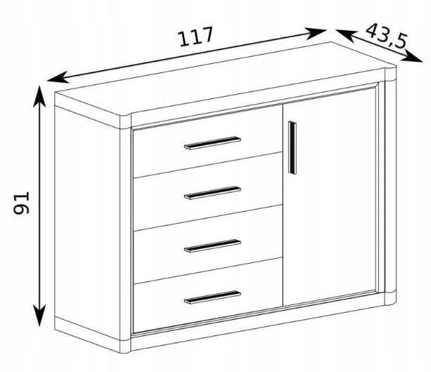 Wprowadź do swojego wnętrza ciepło i styl dzięki komodzie z kolekcji DALLAS w eleganckim kolorze dębu truflowego. Połączenie subtelnych czarnych uchwytów z naturalnym odcieniem drewna tworzy wyrafinowaną kompozycję, która doskonale wpisuje się w nowoczesne aranżacje. Komoda oferuje praktyczne szuflady i drzwi, zapewniając dużo miejsca na przechowywanie, co czyni ją funkcjonalnym i estetycznym dodatkiem do salonu lub sypialni.