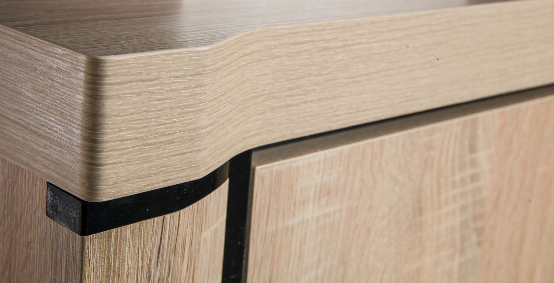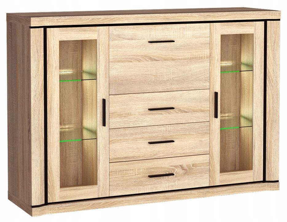Witryna z kolekcji DALLAS to idealny wybór dla miłośników elegancji i nowoczesnego designu. Jej piękny kolor dąb Sonoma wprowadza do wnętrza naturalny urok oraz ciepło, a kontrastujące czarne akcenty dodają jej wyrafinowanego charakteru.