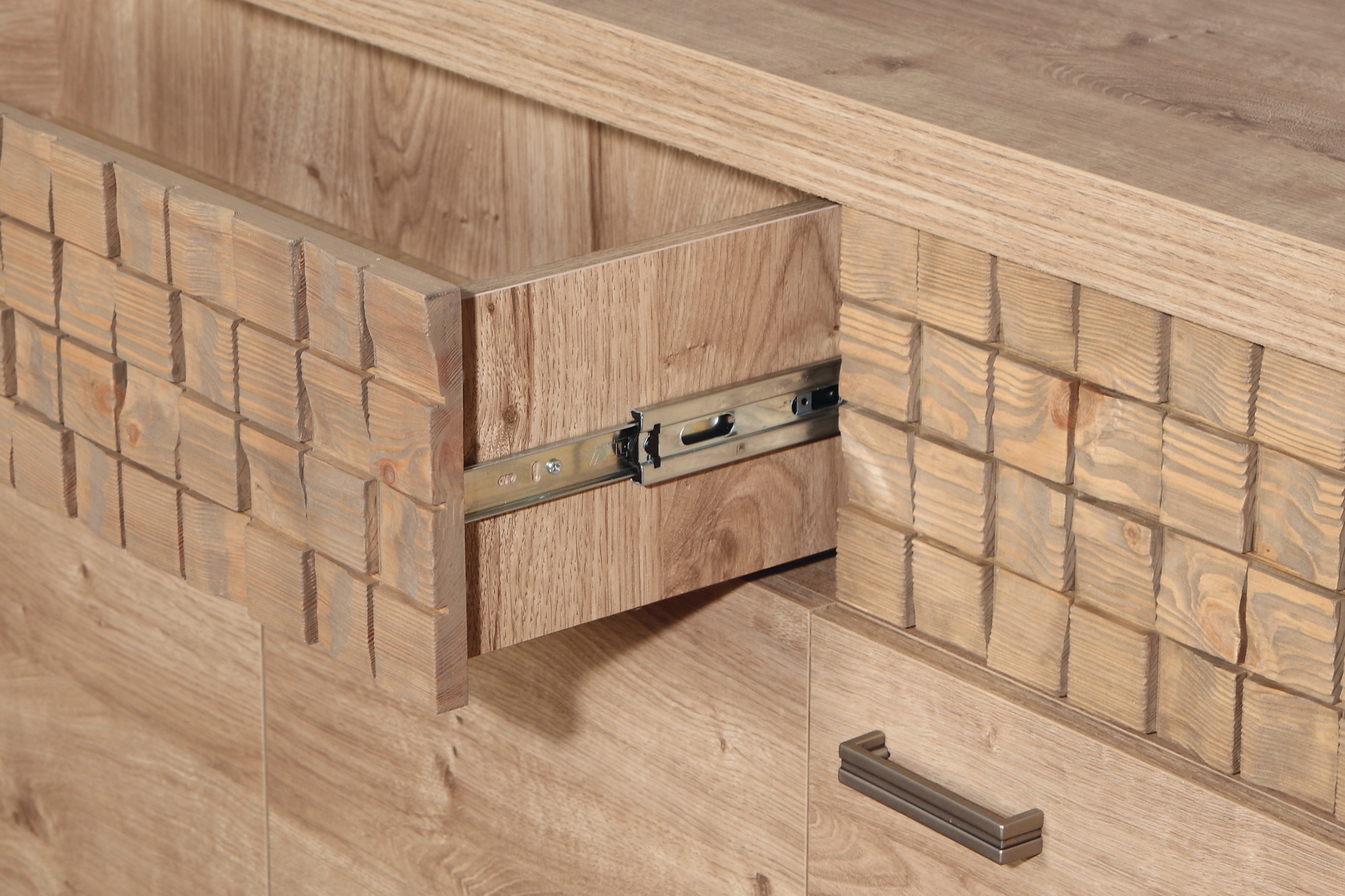 W szufladach zastosowano system PUSH TO OPEN, który zapewnia wygodne użytkowanie i czysty, minimalistyczny wygląd. Drzwi wyposażono w nowoczesne, metalowe uchwyty – to mocny, stylowy akcent, doskonale współgrający z naturalną kolorystyką.