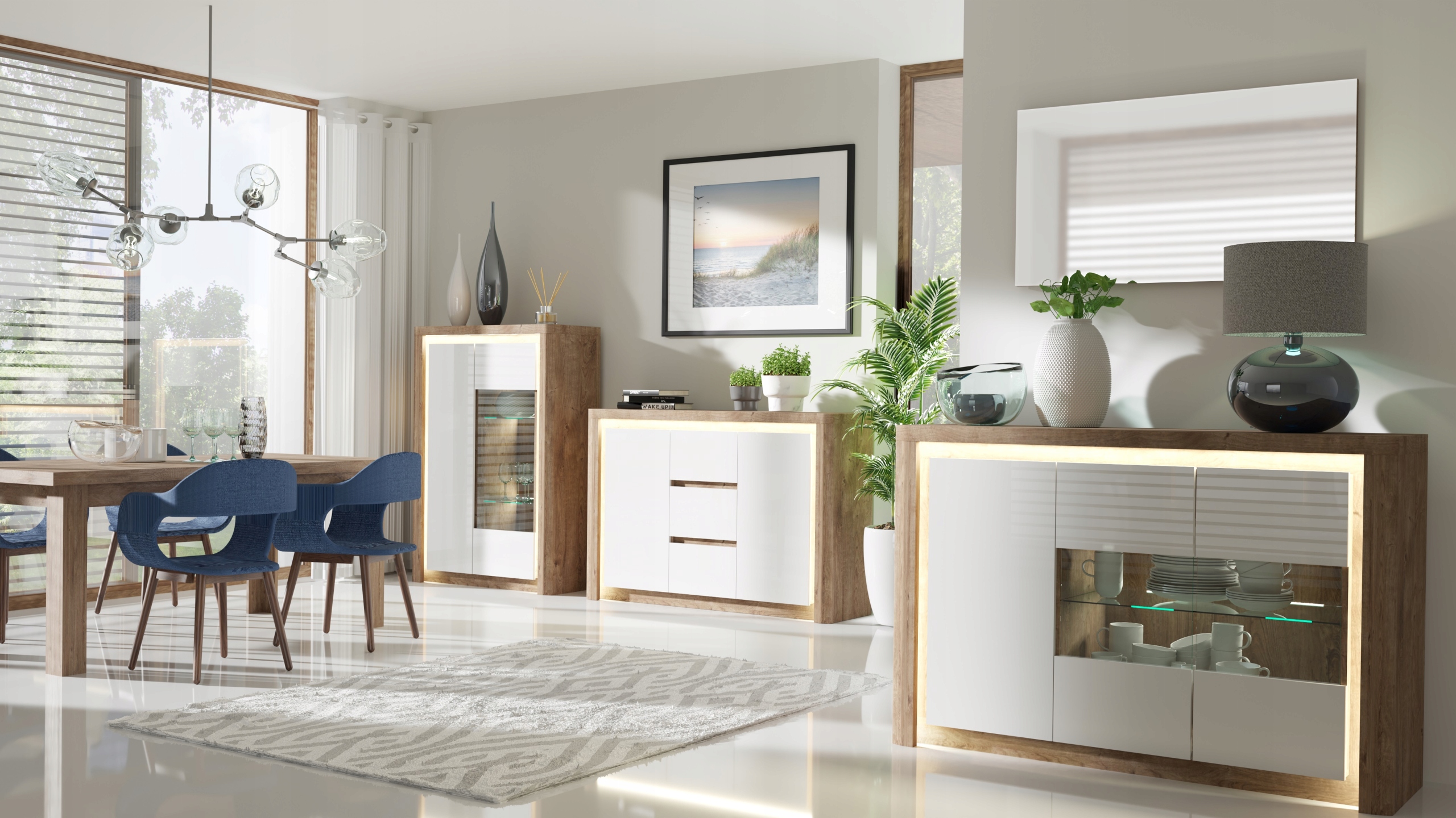 Komoda GLOSS to połączenie nowoczesnego designu i funkcjonalności. Wyposażona w szuflady oraz drzwi z funkcją cichego domyku, zapewnia wygodę i komfort użytkowania. Oświetlenie LED podkreśla elegancki wygląd, dodając wyjątkowego charakteru do salonu, jadalni lub sypialni. Duża i pojemna, idealnie sprawdzi się do przechowywania różnorodnych przedmiotów, tworząc stylowe i nowoczesne wnętrze pełne elegancji.