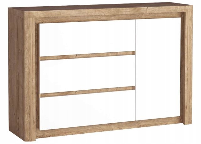 Komoda GLOSS to doskonałe rozwiązanie dla osób ceniących nowoczesny styl i funkcjonalność. Wyposażona w przestronne szuflady i drzwi z funkcją cichego domyku, oferuje wygodne i bezgłośne użytkowanie. Oświetlenie podwieńcowe, już w cenie, dodaje elegancji i podkreśla unikalny design mebla, tworząc przytulną atmosferę w salonie lub sypialni. Połączenie korpusu w odcieniu dębu ribbeck z frontami w białym połysku nadaje wnętrzu nowoczesnego charakteru, doskonale komponując się z różnorodnymi aranżacjami.
