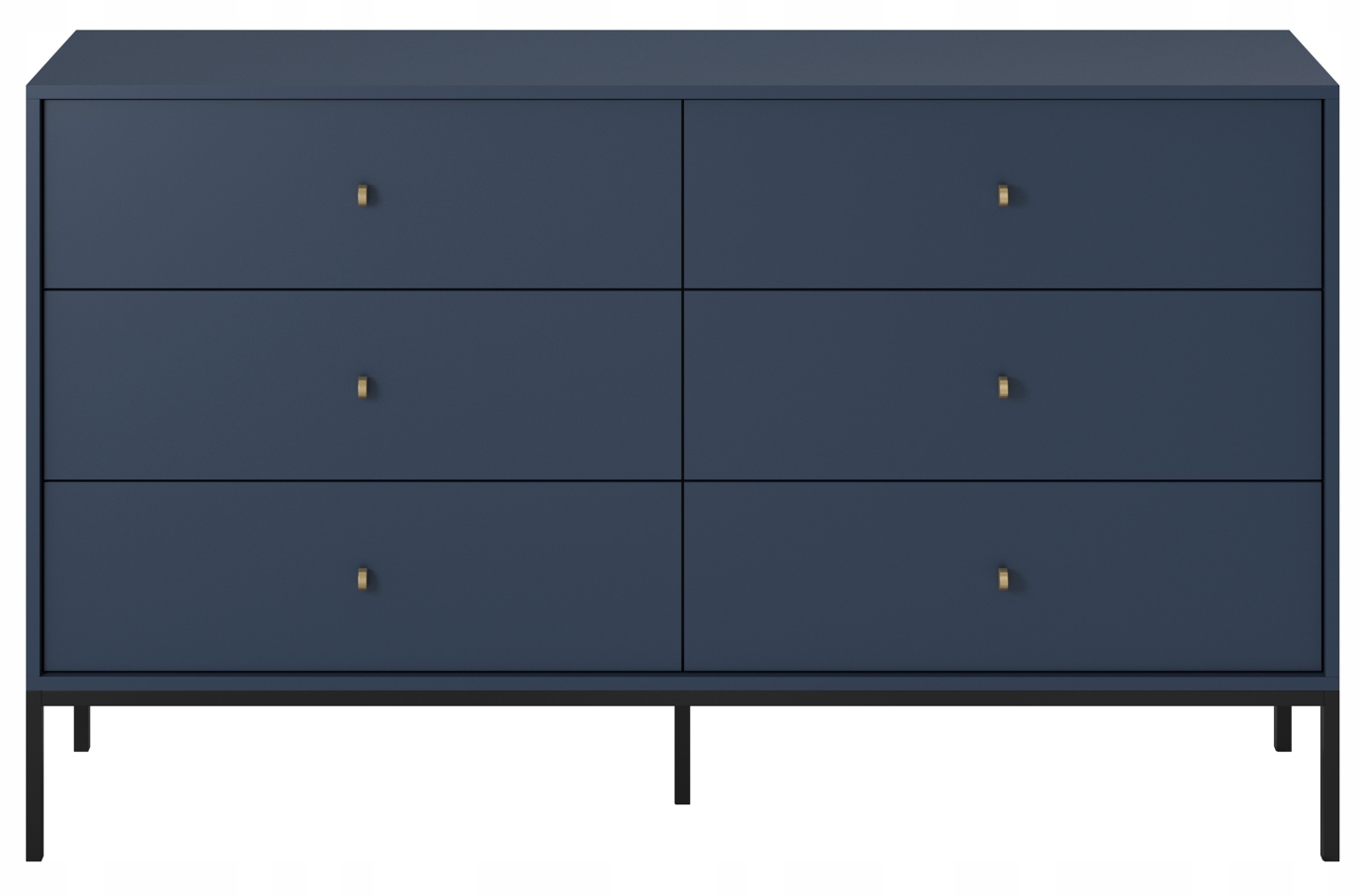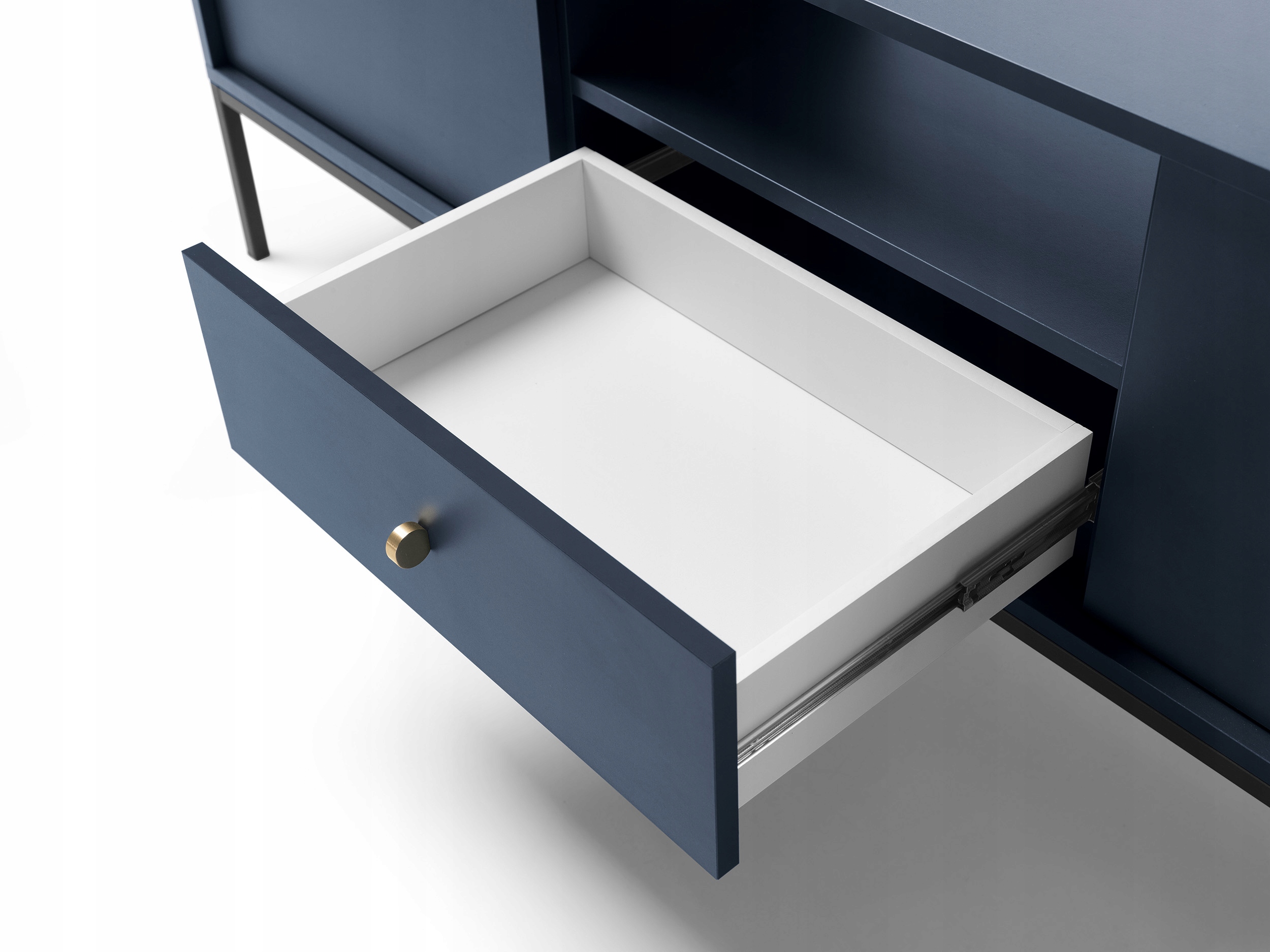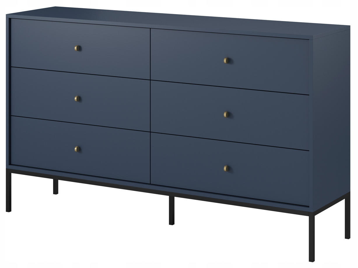 System mebli MONO to doskonała propozycja dla miłośników stylu loftowego w eleganckim, głębokim wydaniu. Kolekcja wyróżnia się granatową kolorystyką, która wnosi do wnętrza wyrafinowanie i styl, a kontrastowe połączenie złotych uchwytów z czarnymi, metalowymi nóżkami nadaje bryłom nowoczesnego, wyrazistego charakteru.