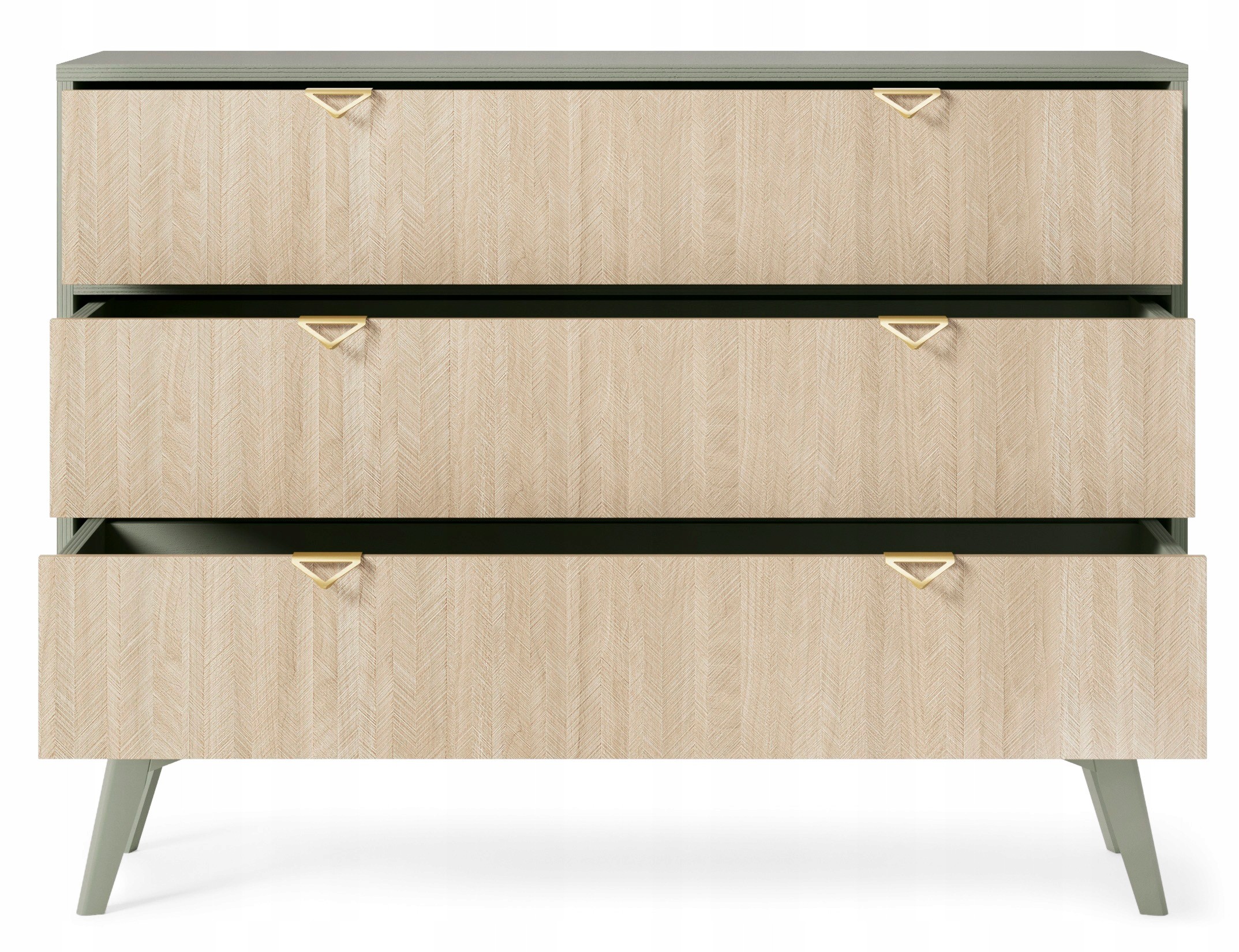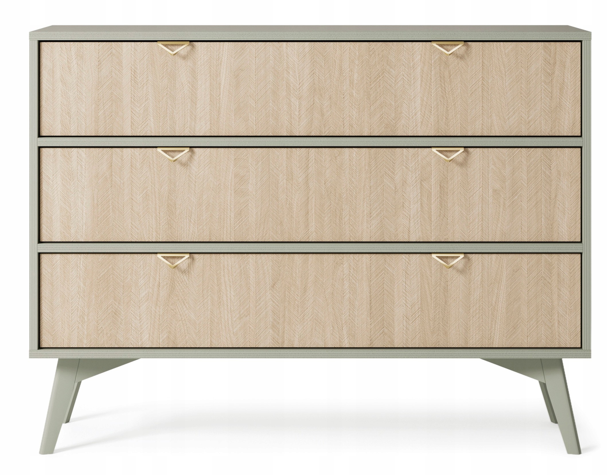 Złote uchwyty w kształcie trójkąta podkreślają luksusowy styl mebla, tworząc wyrafinowany kontrast z eukaliptusowym korpusem. Drewniane nóżki w tym samym odcieniu zapewniają stabilność i lekkość, dzięki czemu komoda świetnie wpisuje się w różne style aranżacji.