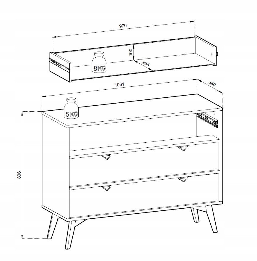 Szuflady posiadają funkcję pełnego wysuwu, co sprawia, że są wyjątkowo praktyczne i funkcjonalne. Wykonana z wysokiej jakości płyty laminowanej o grubości 16 mm, komoda jest trwała i odporna na codzienne użytkowanie. Obrzeża zabezpieczone ABS dodatkowo podkreślają dbałość o szczegóły.