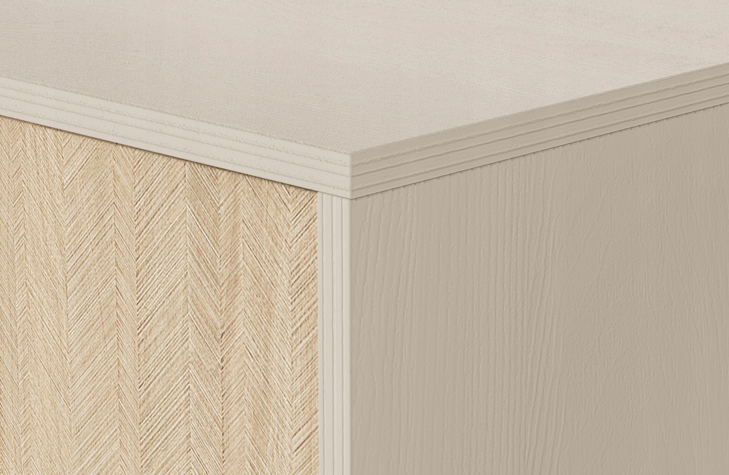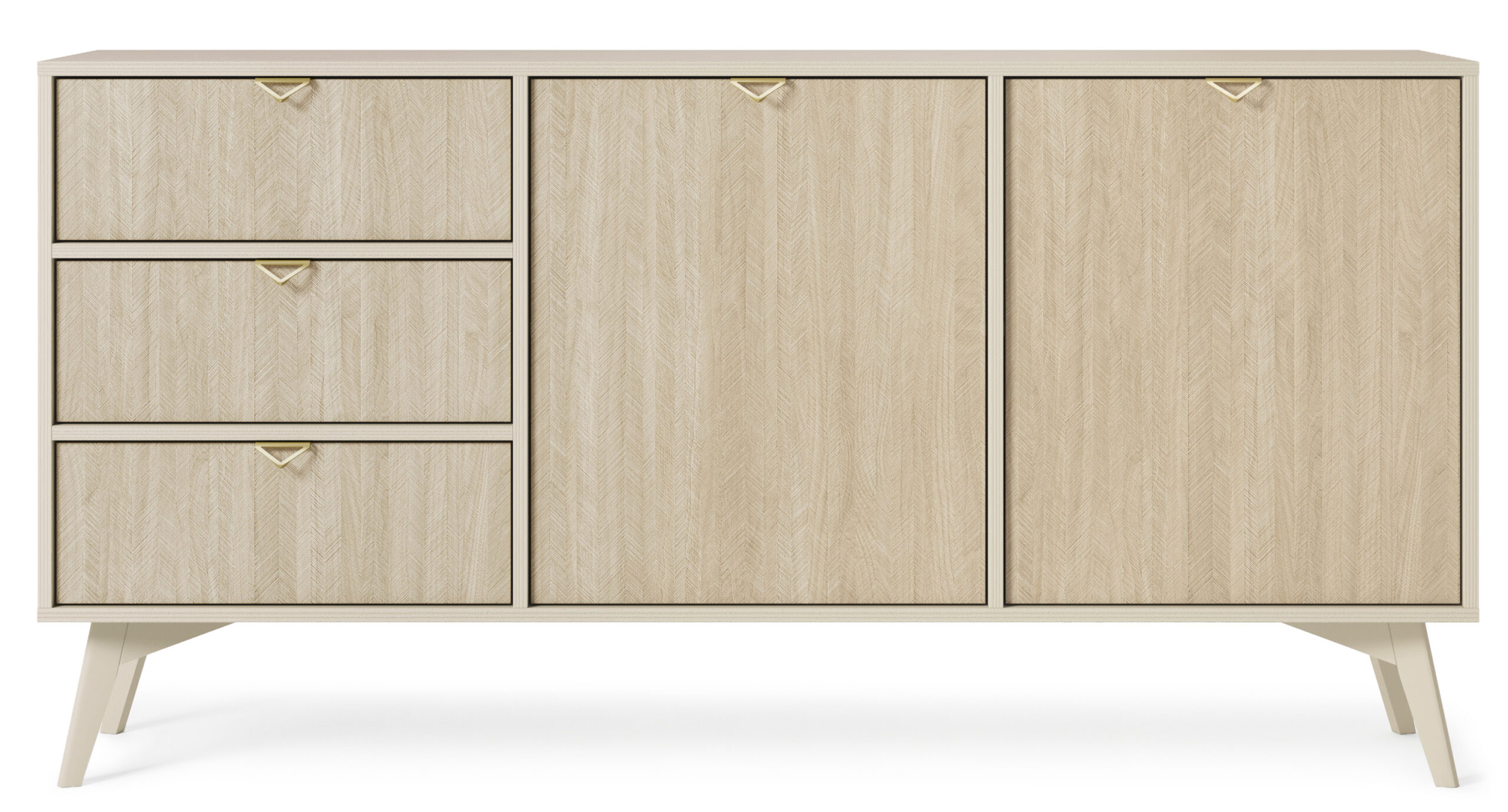 Szeroka komoda z kolekcji GRANNA, wyposażona w trzy szuflady i dwoje drzwiczek, to mebel, który łączy elegancję z funkcjonalnością, idealnie wpasowując się w każde nowoczesne wnętrze. Fronty z subtelnym wzorem jodełki nie tylko zachwycają wyglądem, ale także zapewniają przyjemne doznania dotykowe. Korpus w kolorze beż piaskowy wprowadza do wnętrza spokojną i elegancką atmosferę, tworząc idealną harmonię w każdym pomieszczeniu.