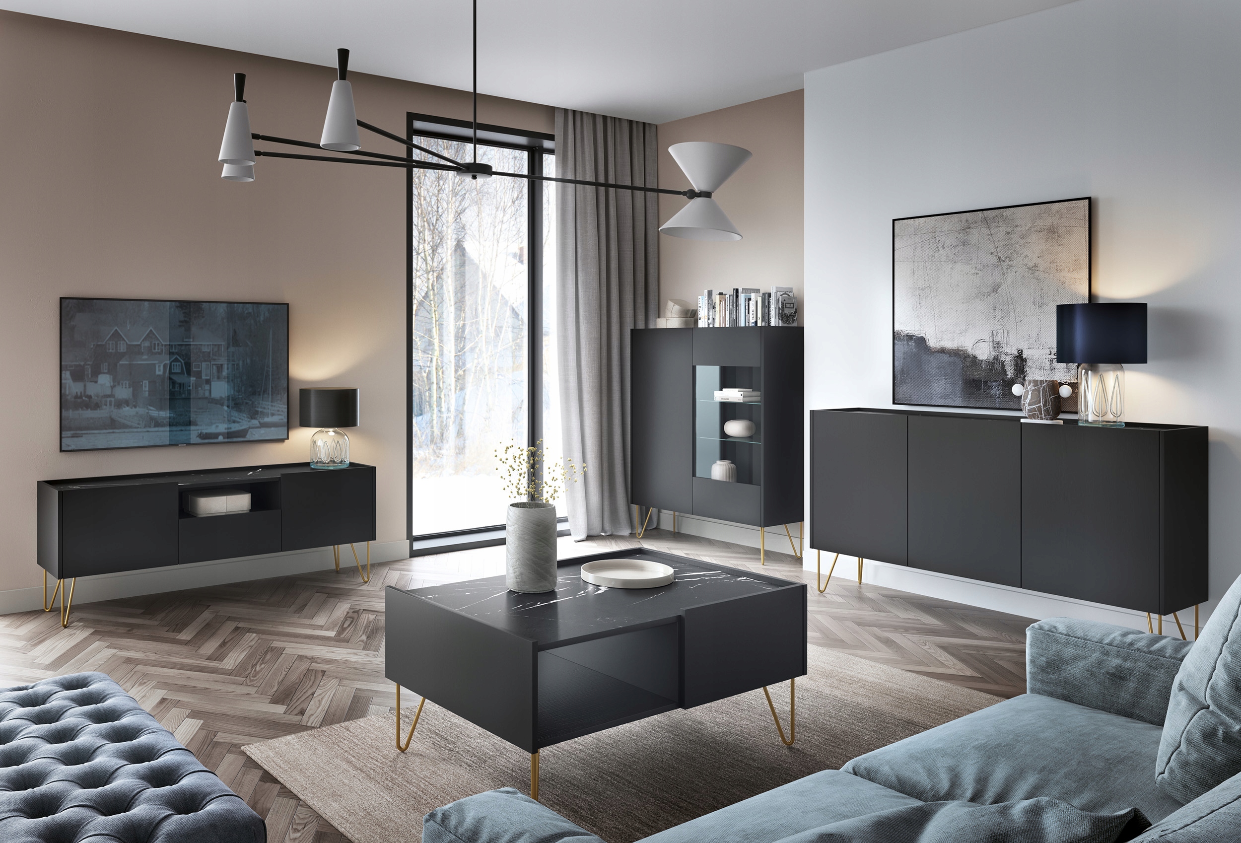 Wyjątkowy czarny grafitowy laminat na korpusie oraz frontach nadaje komodzie elegancki wygląd, a blat imitujący marmur wprowadza element wyrafinowanego designu. Całość dopełniają złote metalowe nogi, które nie tylko dodają stabilności, ale również podkreślają luksusowy charakter mebla.