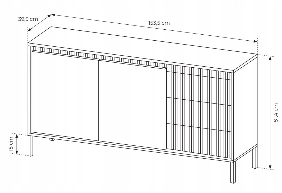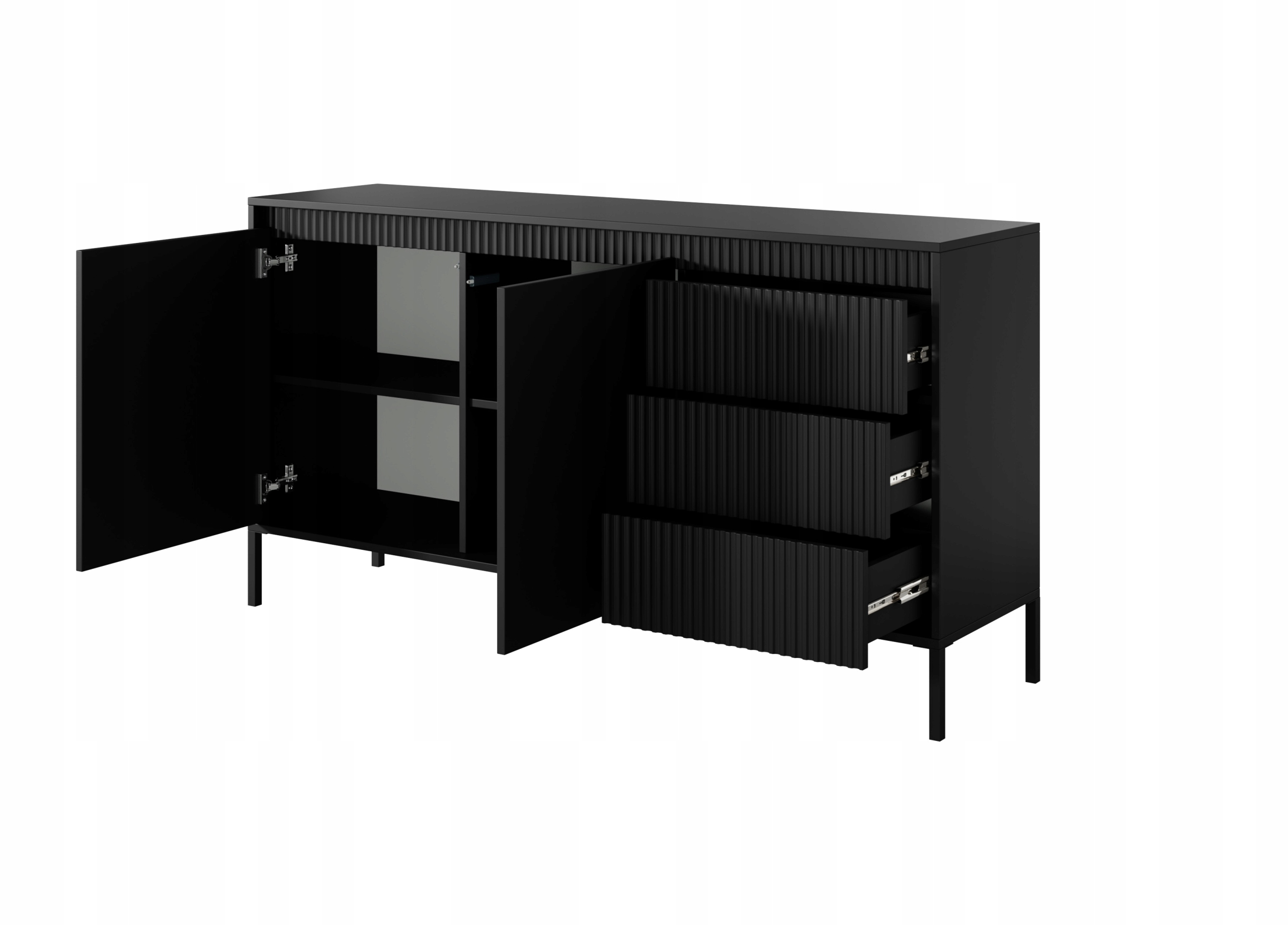 Komoda LOREN to szeroki i stylowy mebel, który doskonale odnajdzie się w nowoczesnych aranżacjach salonu, sypialni czy pokoju dziennego. Ta czarna komoda o szerokości 153,5 cm oferuje optymalne rozwiązania do przechowywania, dzięki dwóm drzwiom, za którymi kryje się praktyczna półka, idealna na większe przedmioty, oraz trzem pojemnym szufladom z funkcją pełnego wysuwu, co pozwala na łatwy i szybki dostęp do zawartości.