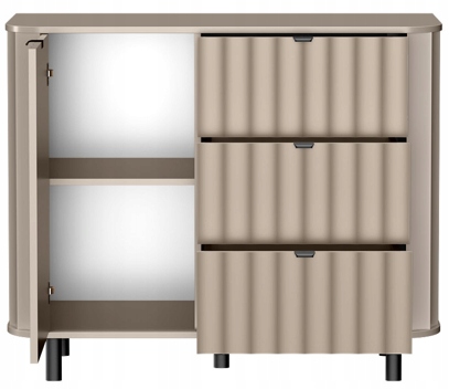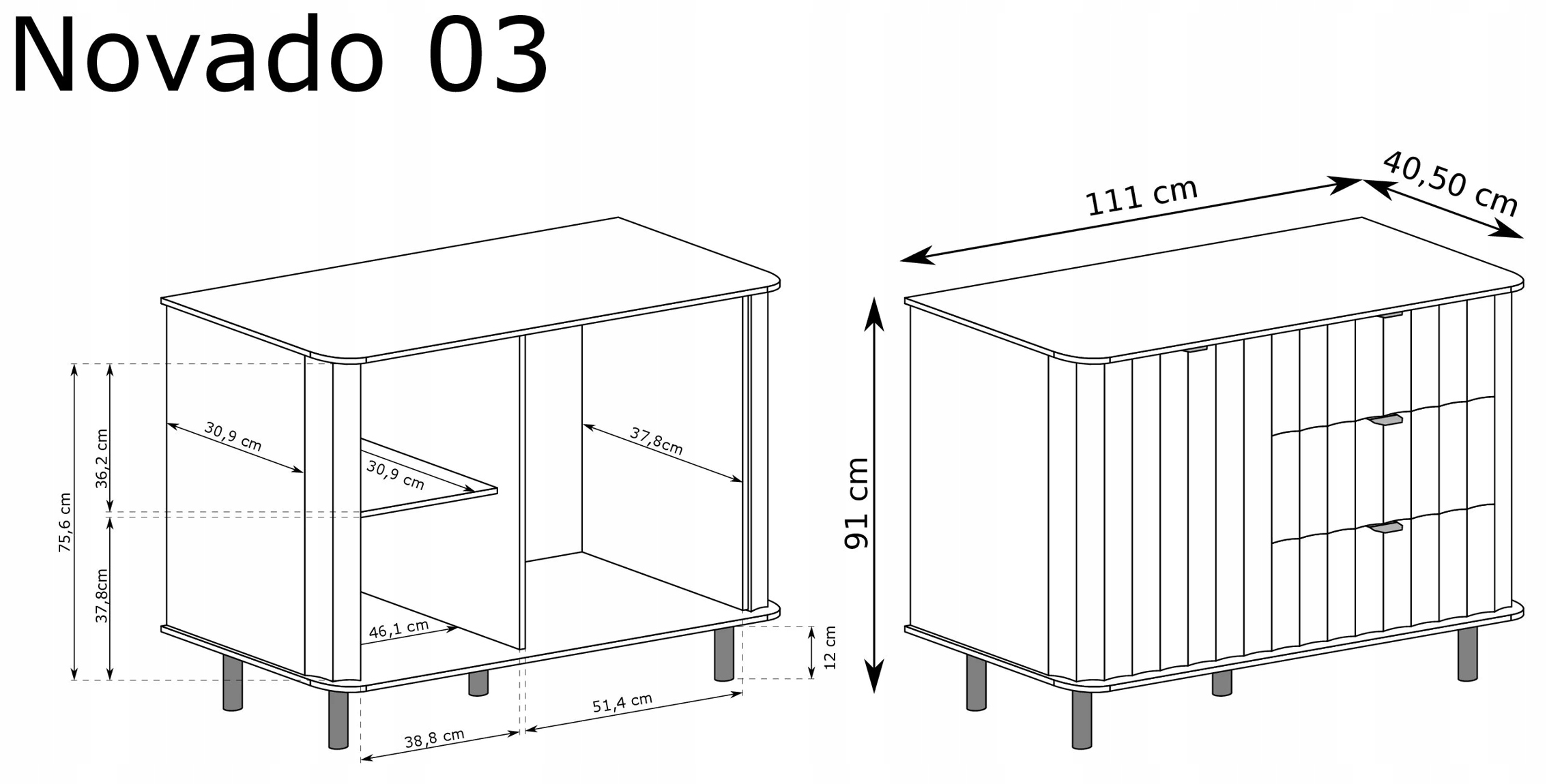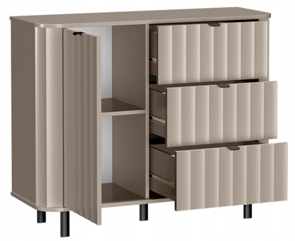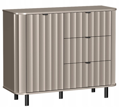 Komoda o szerokości 111 cm, wysokości 91 cm i głębokości 40,5 cm została zaprojektowana z myślą o przechowywaniu i organizacji przestrzeni w salonie, jadalni lub sypialni. Korpus wykonano z laminowanej płyty meblowej, a fronty MDF zostały dodatkowo pokryte folią dla większej trwałości. Obrzeża zabezpieczono odporną okleiną ABS. Całość uzupełniają czarne metalowe uchwyty oraz system cichego domyku, który zwiększa komfort użytkowania.
