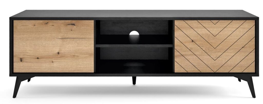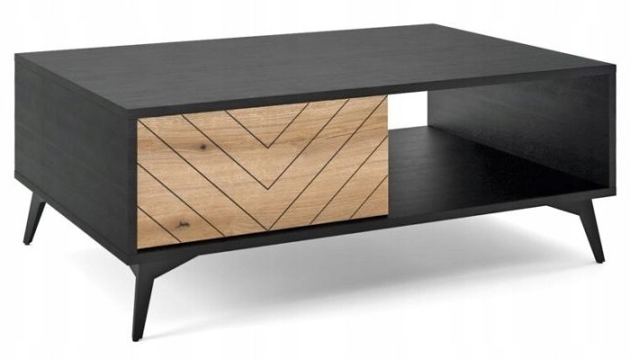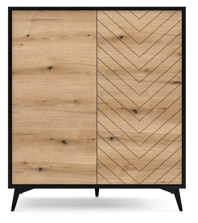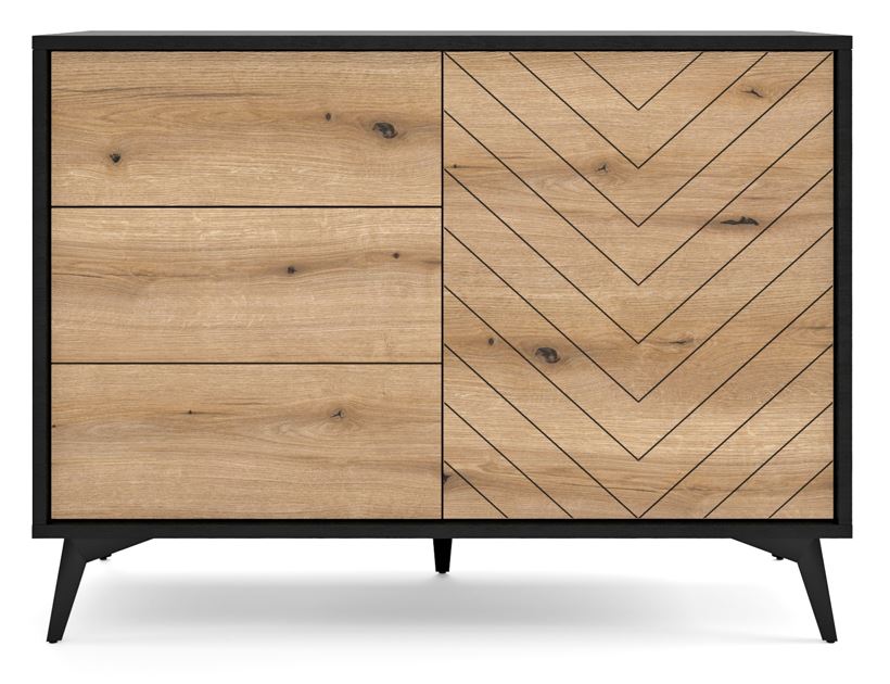 Komoda z kolekcji TANNE, wyposażona w trzy szuflady i jedne drzwiczki, to doskonałe połączenie nowoczesnego designu z funkcjonalnością. Jej frezowane fronty w eleganckim wzorze jodełki nadają meblowi unikalny charakter, a ciemne, matowe wykończenie podkreśla wyrafinowany styl. Komoda jest idealnym wyborem dla tych, którzy poszukują mebli łączących estetykę z praktycznym zastosowaniem.