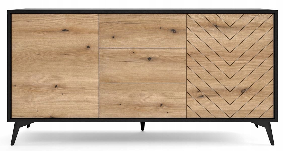 Komoda szeroka z kolekcji TANNE, wyposażona w trzy szuflady i dwoje drzwiczek, to mebel łączący funkcjonalność z nowoczesnym stylem. Frezowane fronty w subtelnym wzorze jodełki oraz ciemne, matowe wykończenie nadają jej elegancki i wyrafinowany charakter, który doskonale wpasowuje się zarówno w nowoczesne, jak i klasyczne wnętrza.