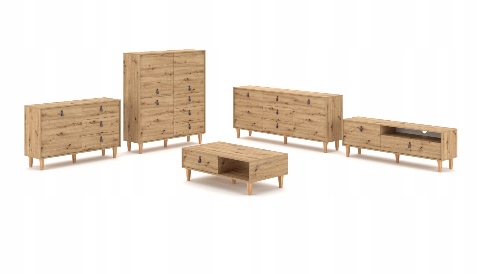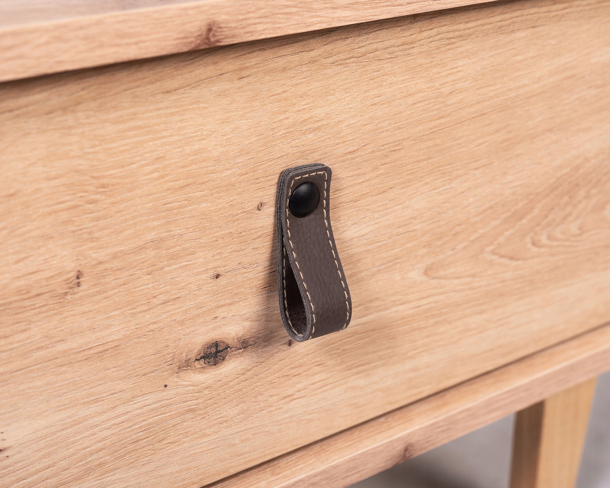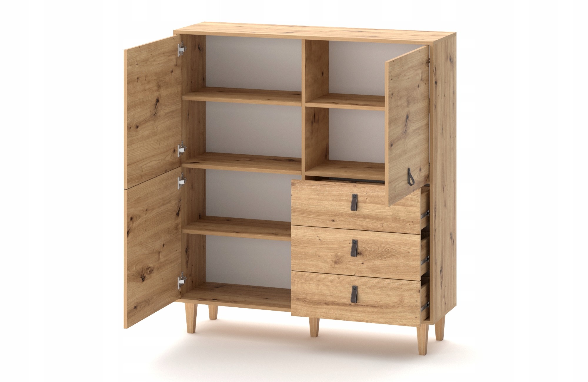 Kolekcja Bari prezentuje wyjątkową komodę o szerokości 135 cm w stylu skandynawskim, wykonaną z płyty laminowanej w kolorze dąb Artisan. Komoda wyróżnia się trzema szufladami i trzema drzwiami z systemem cichego domyku, co zapewnia wygodę i bezszelestne użytkowanie. Dębowe nóżki dodają naturalnego charakteru, a uchwyty z eko-skóry podkreślają nowoczesny design. Dzięki obrzeżom wykończonym ABS-em, mebel jest odporny na uszkodzenia mechaniczne, co zapewnia jego trwałość. To idealna propozycja do salonów, gdzie liczy się styl, funkcjonalność i nowoczesna estetyka.