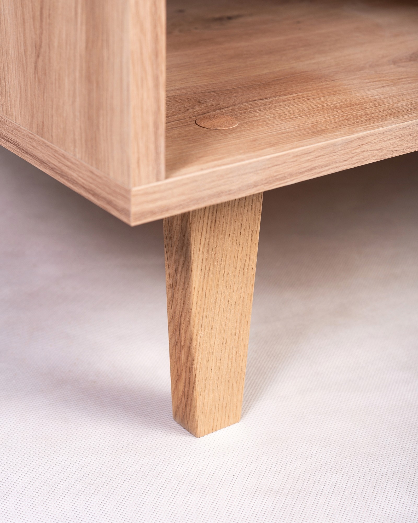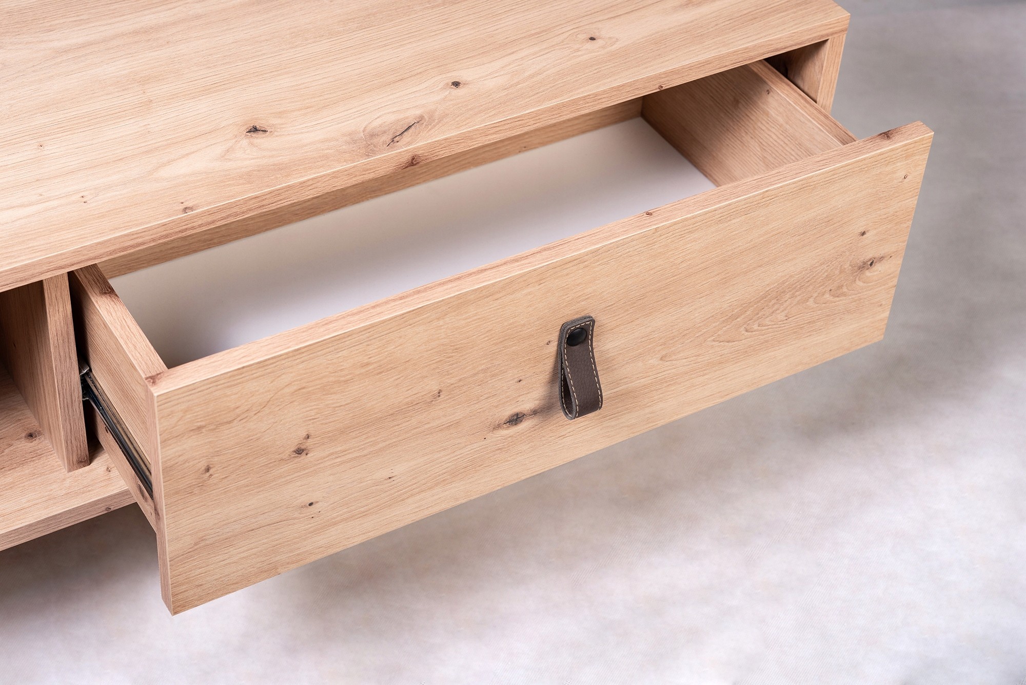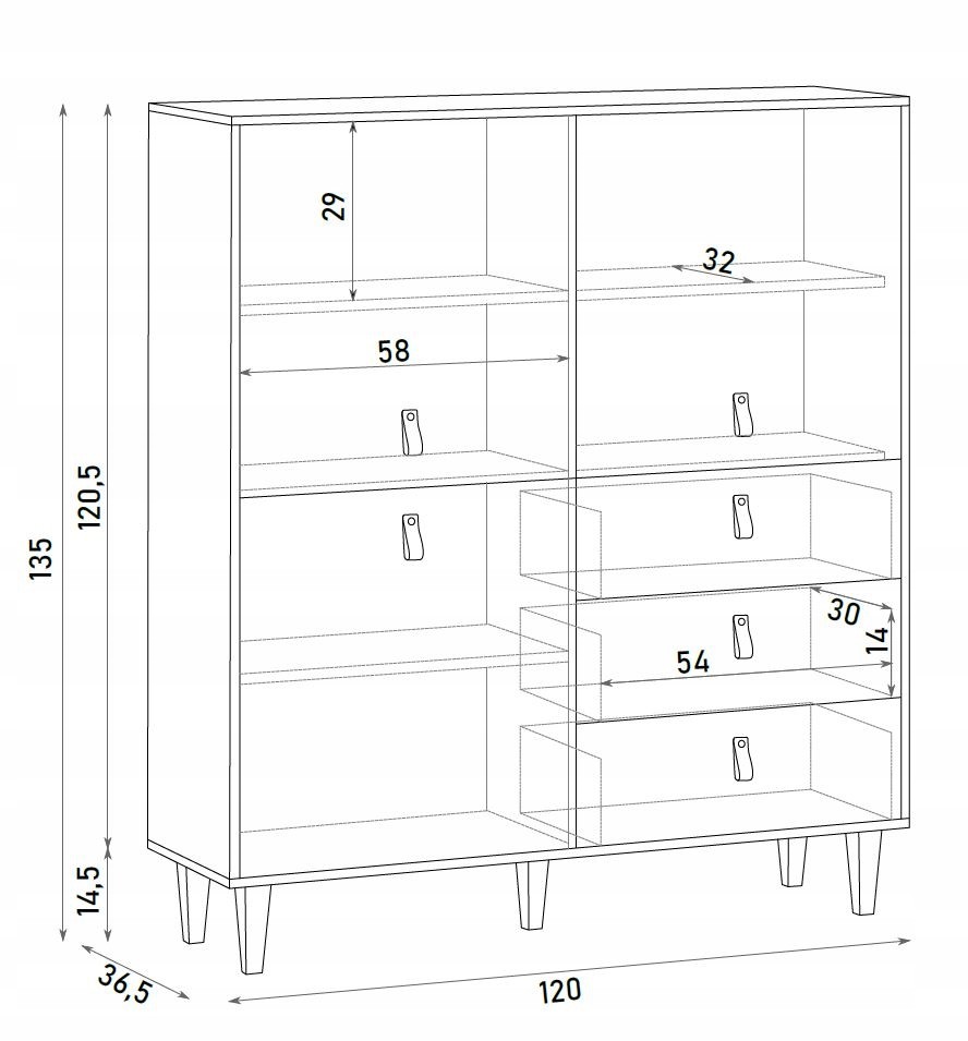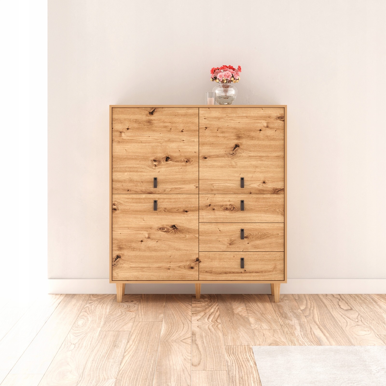 Kolekcja Bari prezentuje wyjątkową komodę o szerokości 135 cm w stylu skandynawskim, wykonaną z płyty laminowanej w kolorze dąb Artisan. Komoda wyróżnia się trzema szufladami i trzema drzwiami z systemem cichego domyku, co zapewnia wygodę i bezszelestne użytkowanie. Dębowe nóżki dodają naturalnego charakteru, a uchwyty z eko-skóry podkreślają nowoczesny design. Dzięki obrzeżom wykończonym ABS-em, mebel jest odporny na uszkodzenia mechaniczne, co zapewnia jego trwałość. To idealna propozycja do salonów, gdzie liczy się styl, funkcjonalność i nowoczesna estetyka.