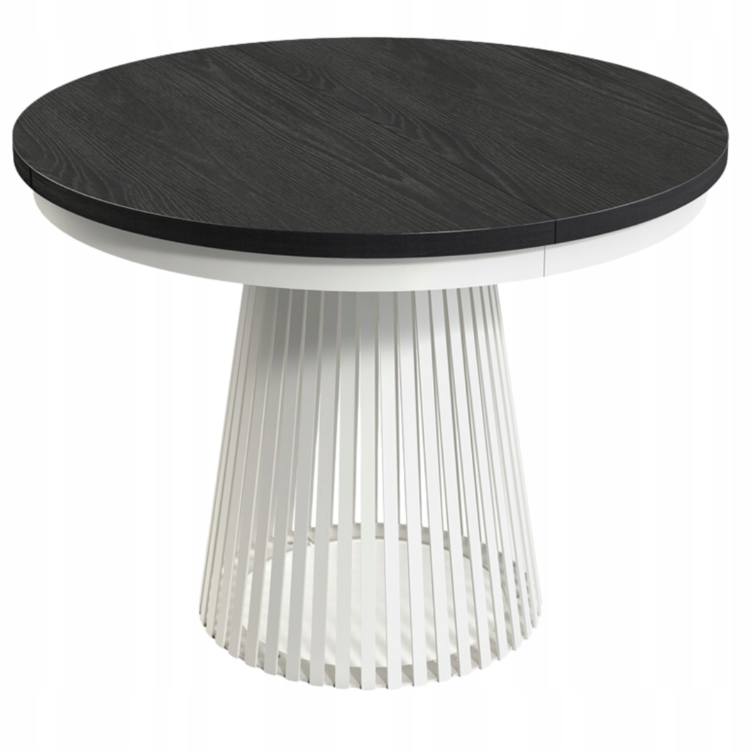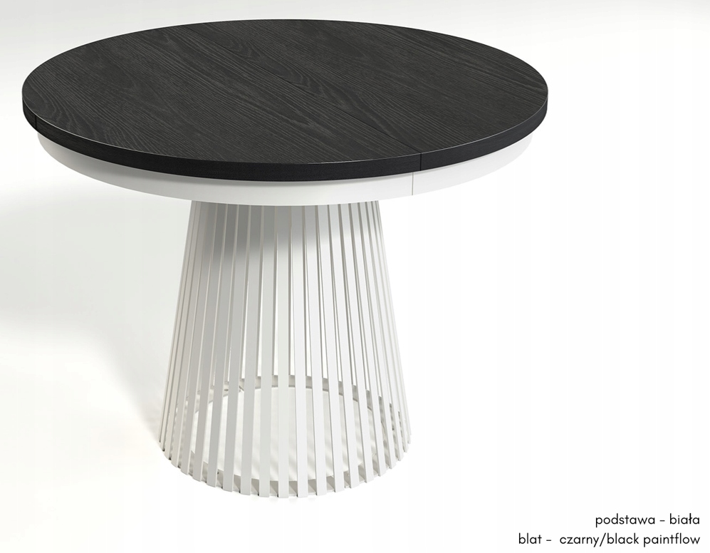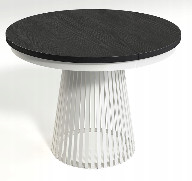 Stół LAMELLA z białą podstawą i blatem w czarnym macie to propozycja, która doskonale wpisuje się w modne, minimalistyczne wnętrza. Średnica stołu w wersji złożonej wynosi 100 cm, co zapewnia komfortowe miejsce dla czterech osób. Po dodaniu jednej lub dwóch wkładek o długości 40 cm każdy, można uzyskać długość 140 cm lub 180 cm, idealną na większe spotkania rodzinne lub przyjęcia. Wkładki nie są przechowywane wewnątrz stołu i wymagają osobnego miejsca na przechowywanie.