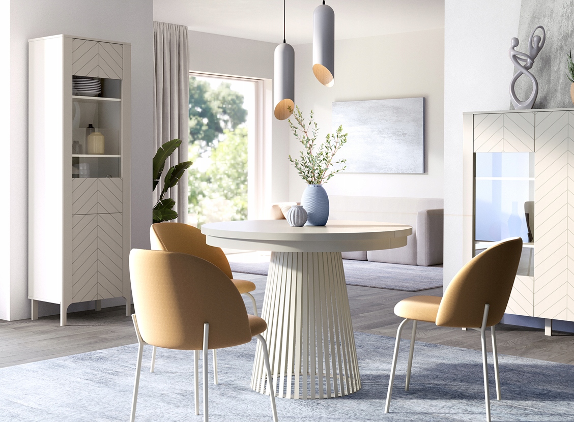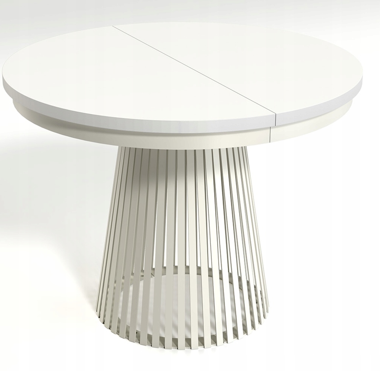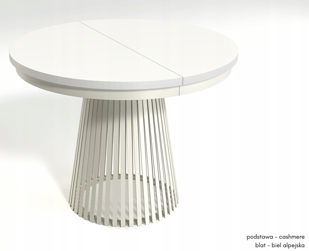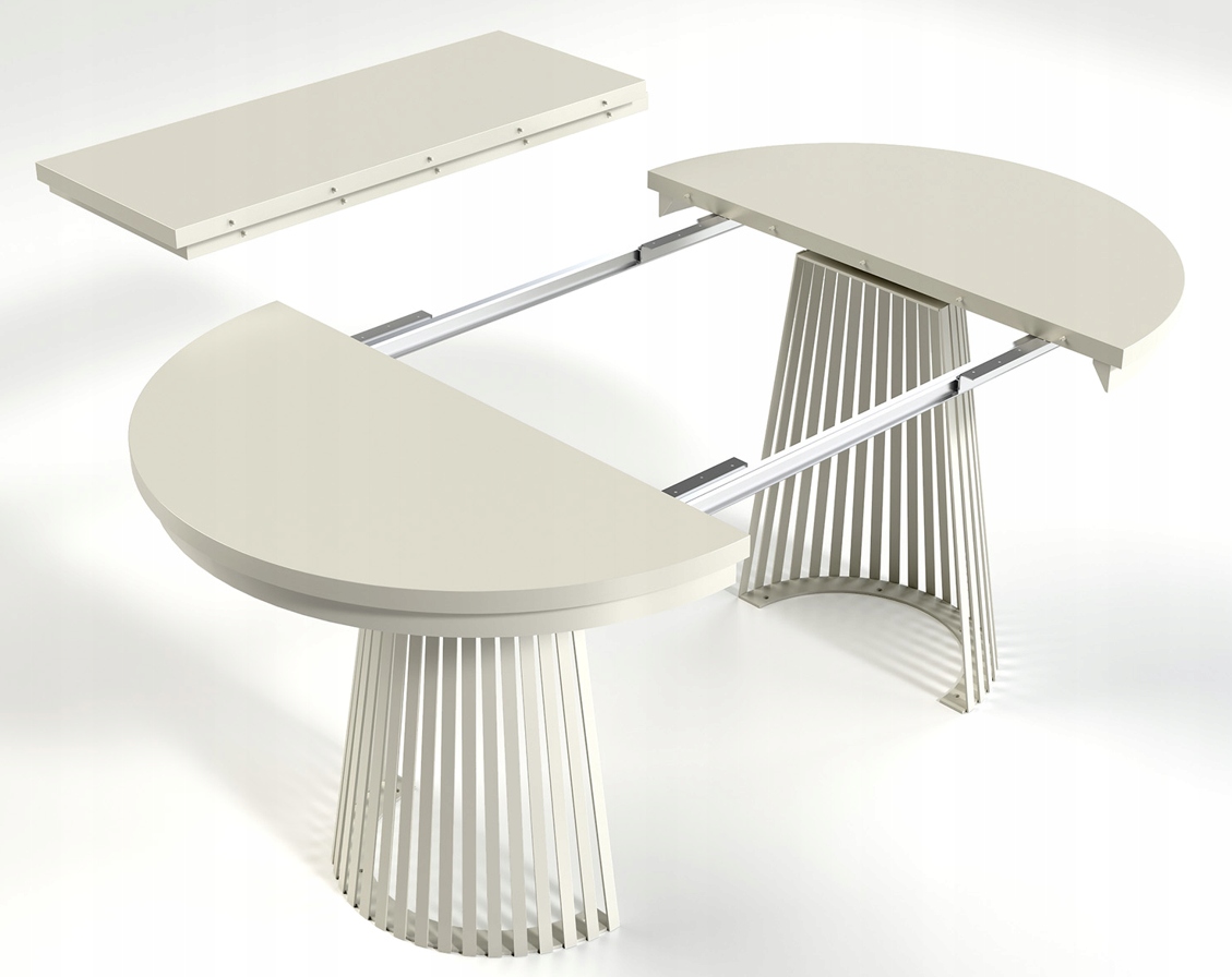 Metalowa podstawa w kolorze kaszmir nadaje bryle wyjątkowego charakteru, jednocześnie zapewniając stabilność konstrukcji. Stół w wersji złożonej ma średnicę 100 cm, a dzięki dwóm wkładkom po 40 cm można go powiększyć do długości 140 cm lub nawet 180 cm. Wkładki należy przechowywać poza stołem, co daje pełną swobodę użytkowania i wyboru rozmiaru w zależności od okazji.