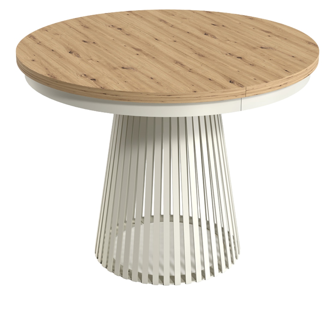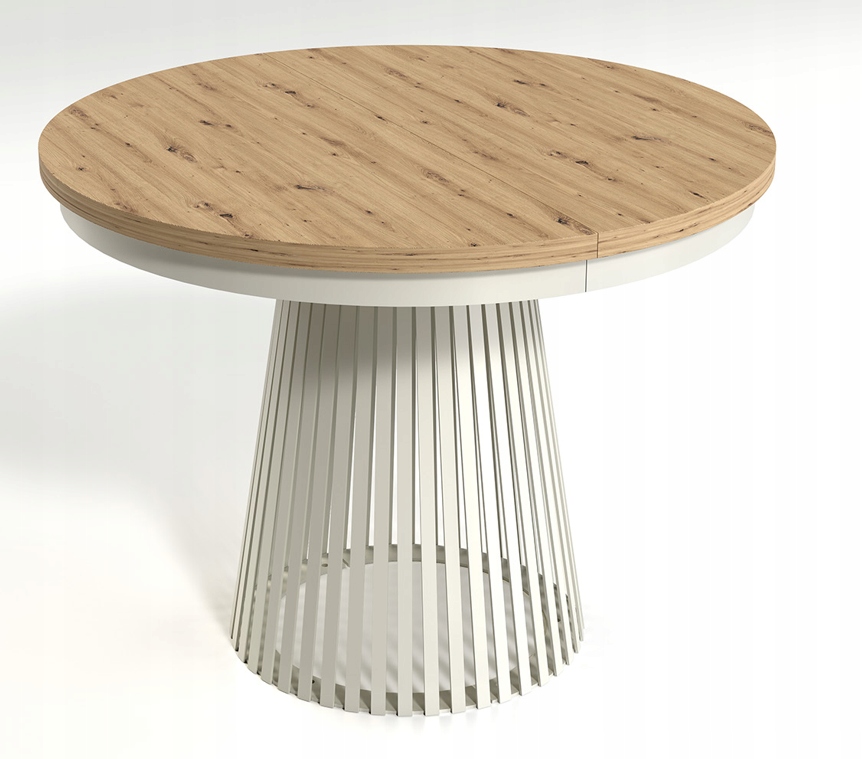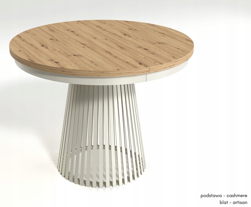 Stół okrągły rozkładany LAMELLA z blatem w dekorze dąb artisan zachwyca subtelnym usłojeniem i ciepłym odcieniem drewna, który ociepla przestrzeń i dodaje jej przytulności. Gruby blat 32 mm wykończono trwałym obrzeżem ABS, odpornym na codzienne użytkowanie.