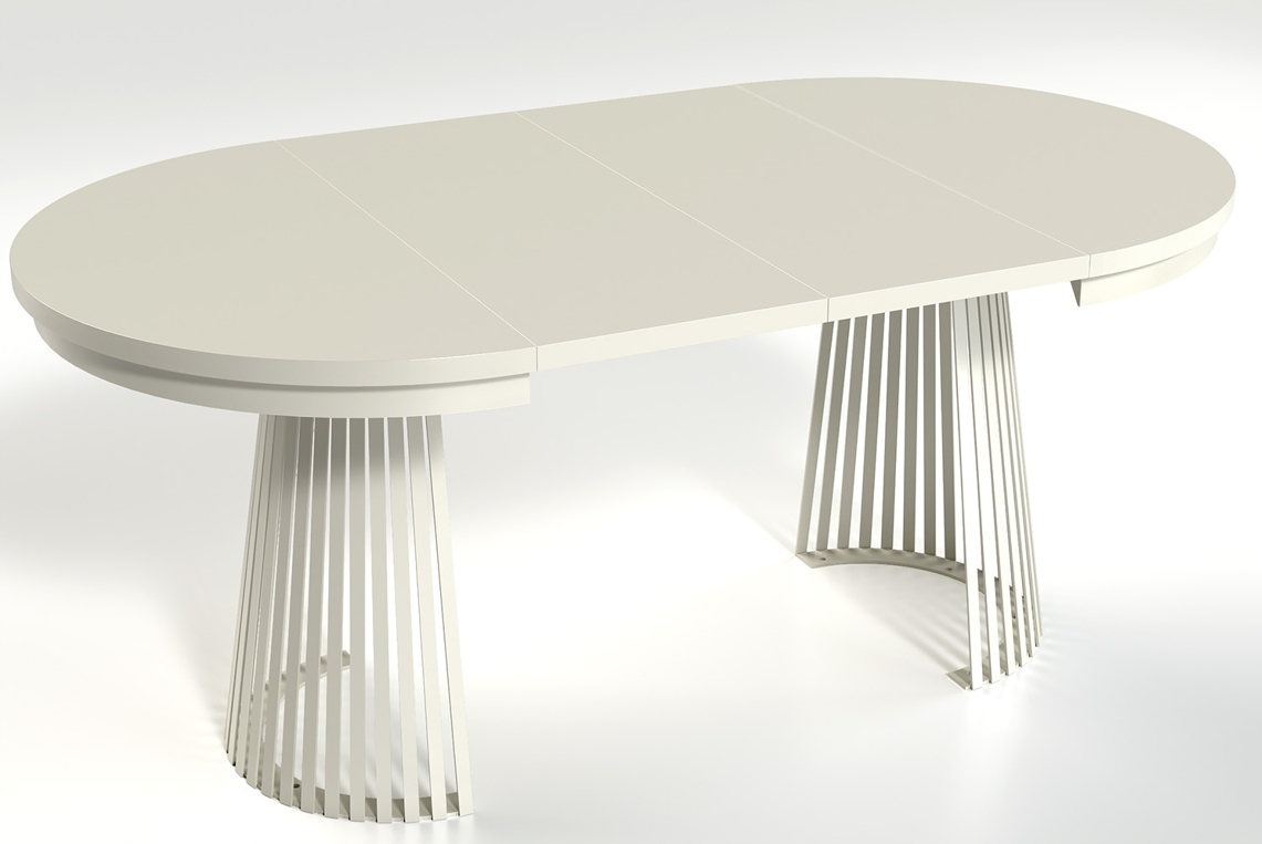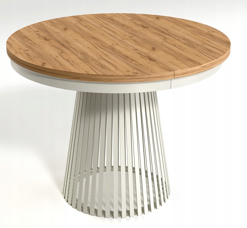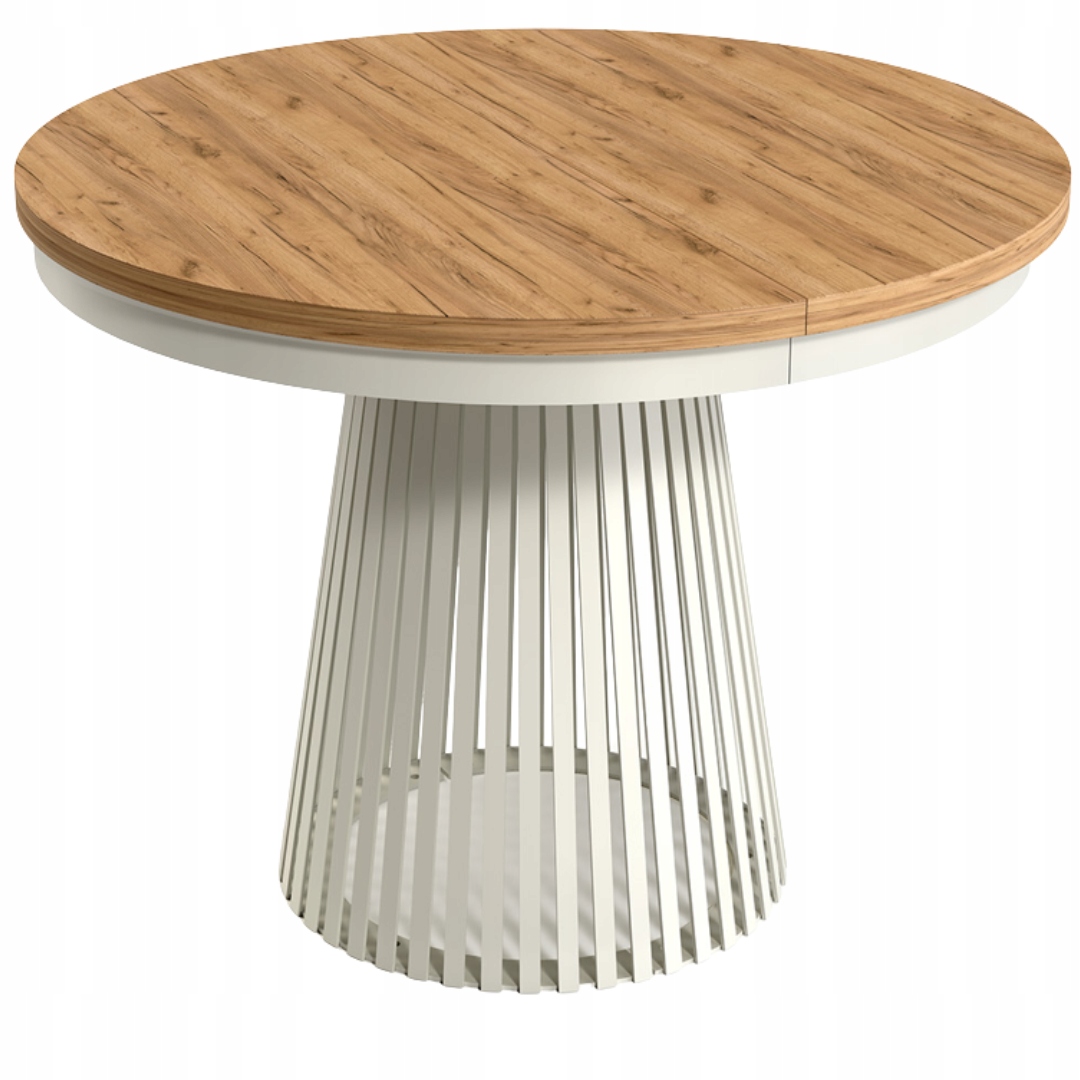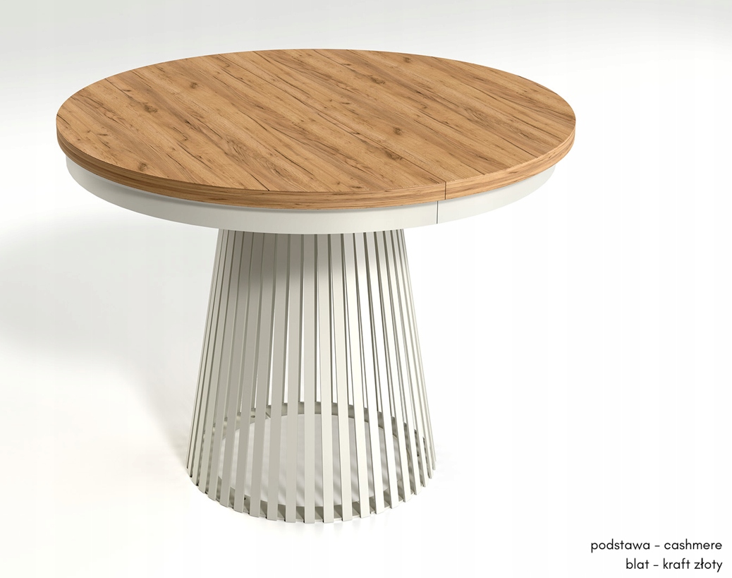 Metalowa podstawa w kolorze kaszmir, składająca się z pionowych lameli, tworzy stabilną, a zarazem efektowną bryłę. Stół ma średnicę 100 cm, a dzięki zastosowaniu dwóch wkładek (każda o długości 40 cm) może osiągnąć długość 140 cm lub maksymalnie 180 cm, zapewniając komfort dla większej liczby osób. Wkładki nie mieszczą się wewnątrz stołu – należy je przechowywać osobno.