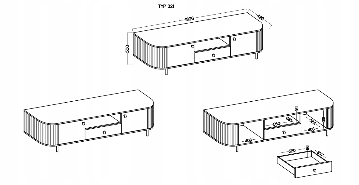 Szafka RTV z kolekcji OVALIO została zaprojektowana z myślą o wygodnej organizacji strefy telewizyjnej w salonie. Dwie zamykane szafki oraz jedna pojemna szuflada zapewniają funkcjonalne miejsce do przechowywania sprzętu i akcesoriów RTV. Otwarta wnęka umożliwia wygodne ustawienie dekodera lub konsoli, a szeroki blat stanowi stabilną podstawę pod telewizor. Konstrukcja oparta na metalowych nogach o wysokości 15 cm nadaje meblowi lekkości i ułatwia utrzymanie czystości pod szafką.