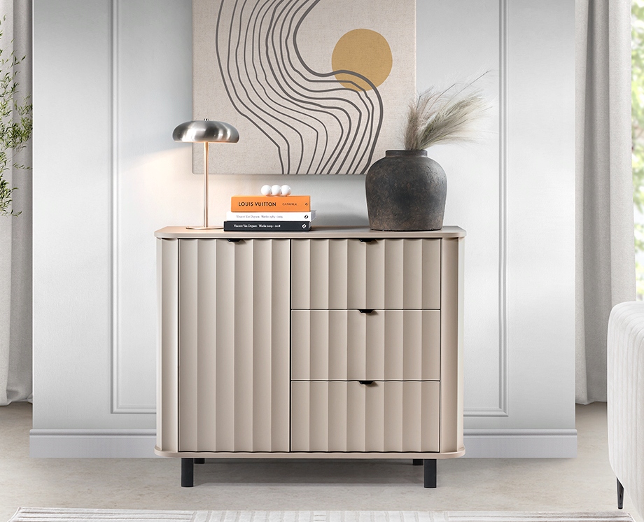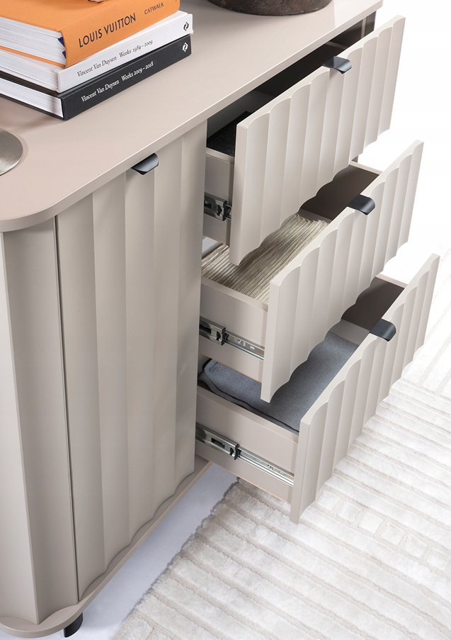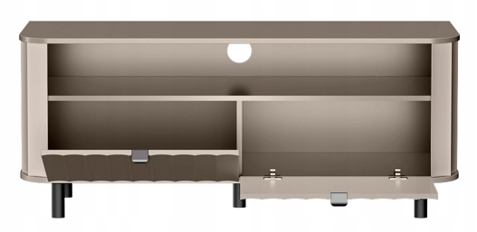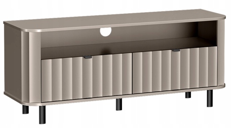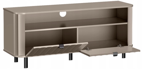 Korpus w subtelnym odcieniu Clay Gray wykonano z wytrzymałej, laminowanej płyty meblowej, a eleganckie frezowane fronty z MDF nadają całości wyjątkowego charakteru. Smukłe, czarne nogi ze stali malowanej proszkowo nadają konstrukcji lekkości i świetnie komponują się z metalowymi uchwytami w tym samym kolorze. Przemyślane wnętrze szafki RTV zapewnia miejsce do przechowywania akcesoriów oraz estetyczne ukrycie kabli, co pozwala utrzymać porządek w strefie rozrywki.
